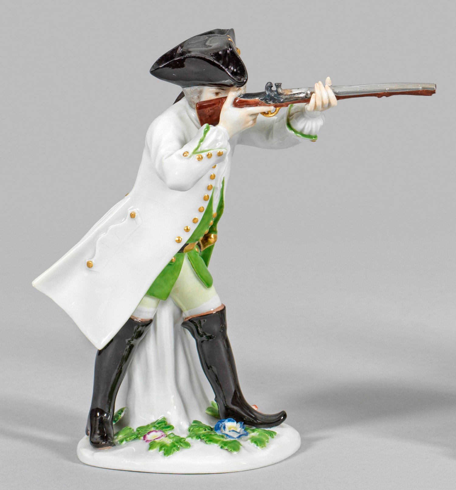 Auf flachem, mit plastischen Blüten und Blättern belegtem Sockel, ein in Schießposition stehender Jäger in langem, weißem Rock über moosgrüner Weste mit kniehohen, schwarzen Stiefeln. Das Haar von einem schwarzen Dreizack bedeckt. Polychrome Malerei mit dezenter Goldstaffage. Entw. Johann Friedrich Eberlein. Modell-Nr. 867. Schwertermarke. H. 16,5 cm.