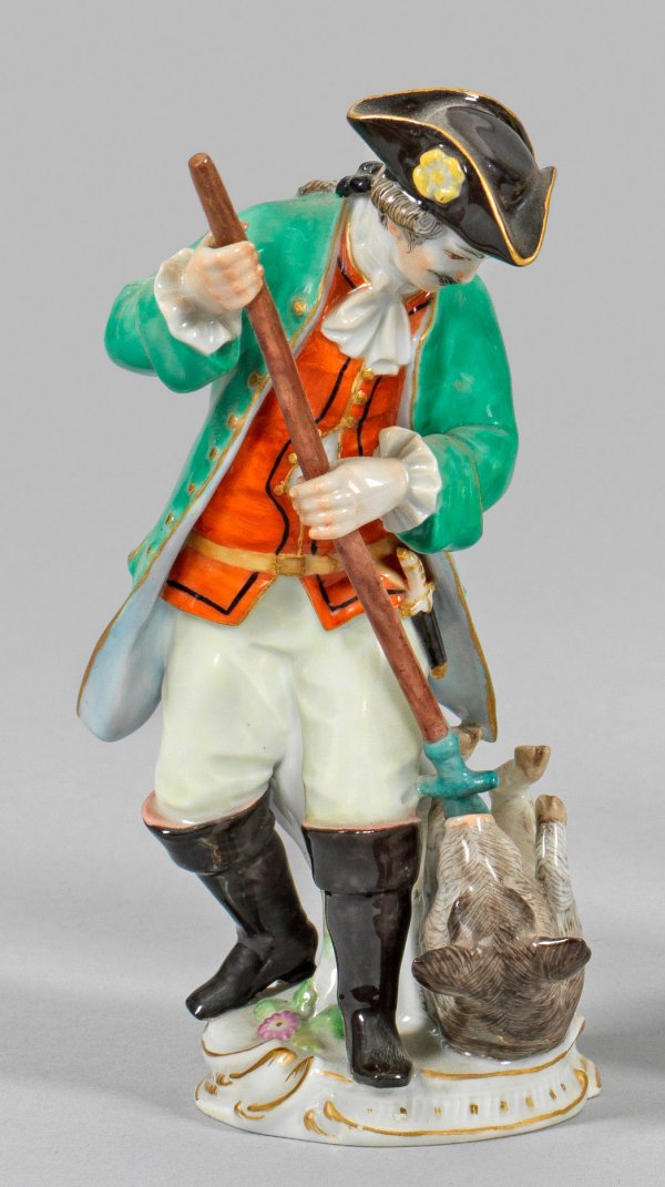 Auf rocailleförmig gerahmtem Sockel stehender Jäger in seegrünem Jagdrock über weißem Hemd und roter Weste, mit einer Lanze ein Wildschwein erlegend. Polychrome Malerei mit dezenter Goldstaffage. Modell-Nr. B 43. Minim. rest.; Schwertermarke. H. 13,5 cm.