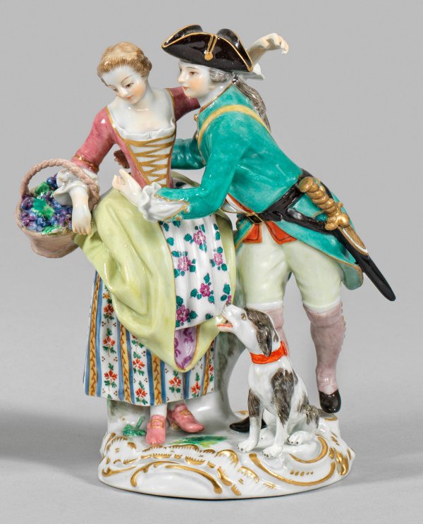 Auf rocaillereliefiertem Sockel stehendes, sich umarmendes Paar. Die junge Dame am rechten Arm einen mit Trauben gefüllten Korb haltend. Zu ihren Füßen sitzender Hund. Entw. Johann Joachim Kaendler. Rest.; Schwertermarke. H. 14,5 cm.