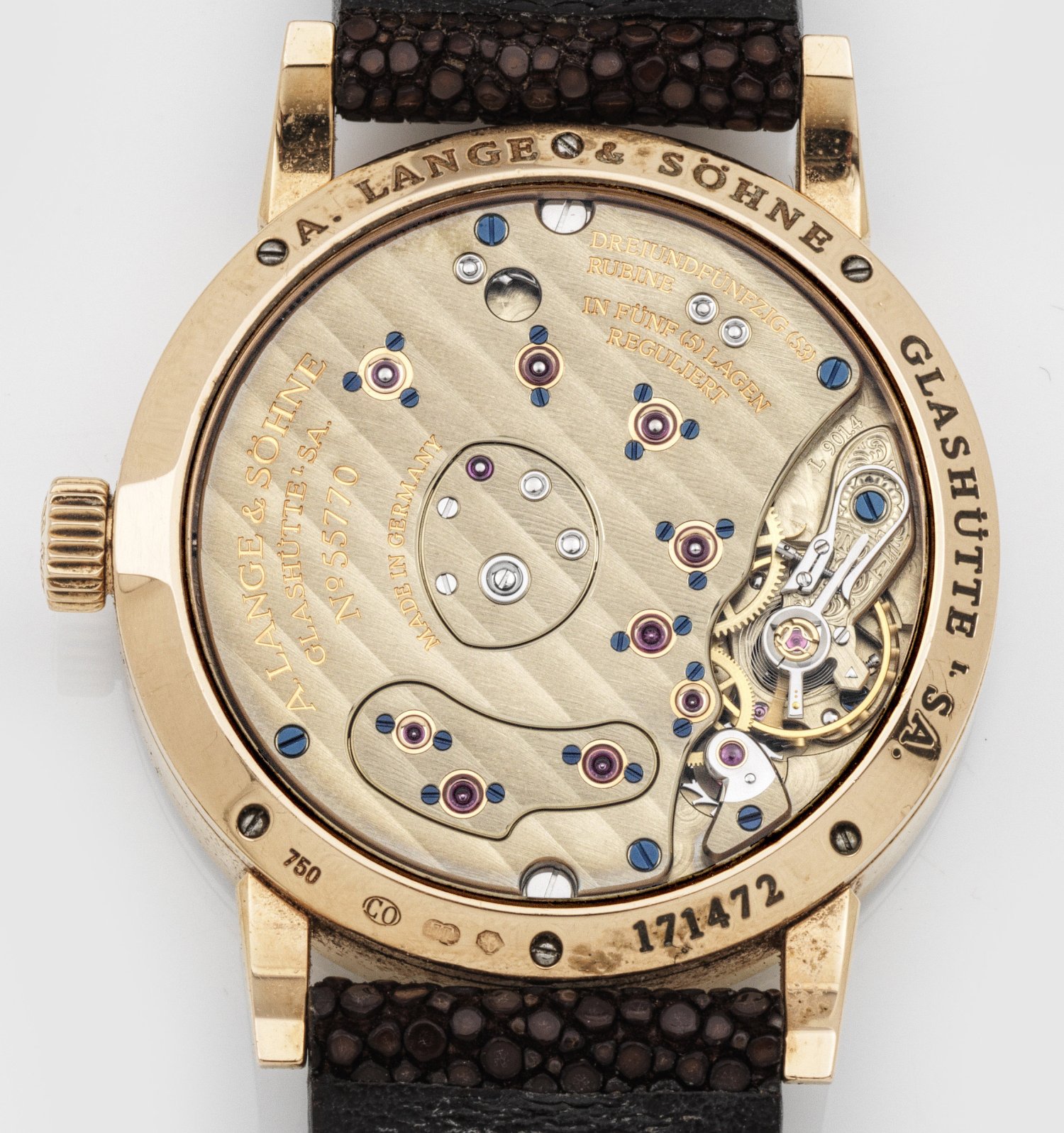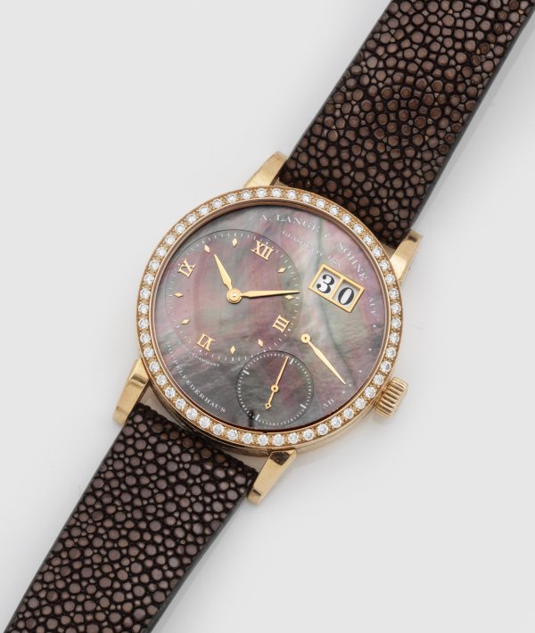 Roségold, gest. 750. Rundes, beidseitig verglastes Uhrengehäuse, Lünette umlaufend besetzt mit Brillanten, Perlmutterzifferblatt mit goldenen Indexen, römischen Ziffern, kleiner Sekunde, Datums- und Gangreserveanzeige. Armband aus brauner Rochenhaut, Lange-Dornenschließe aus korrespondierendem Gold. Automatikwerk mit Handaufzug. Durchmesser 36,1 mm. Herstellerzeichen. Ref.- und Gehäuse-Nr. 5570/117472. Gew. ca. 80,8 g.
