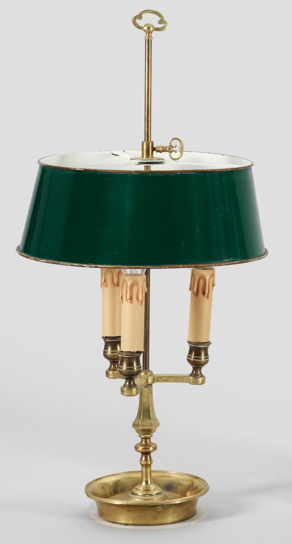 3-flg.; Messing sowie grün lackiertes Blech. Über schalenförmigem Rundfuß gekanteter Balusterschaft sowie gerade Leuchterarme mit vasenförmigen Tüllen. Davon ausgehend schlanker Schaft als Träger für konischen, höhenverstellbaren Lampenschirm. Elektrifiziert. H. 59 cm.