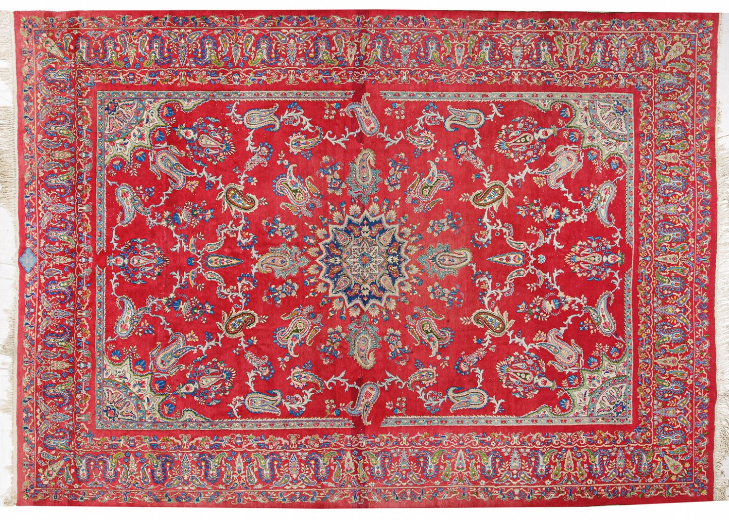Persien. Mitte 20. Jh.; Wolle auf Baumwolle. Im leuchtend roten Innenfeld Zentralmedaillon und kleine Ecklösungen sowie flächendeckende Musterung aus großen Bothéblüten. Umlaufend breite, korrespondierende Bordüre. Sign.; Teilw. nachgeknüpft. 247 cm x 349 cm.
