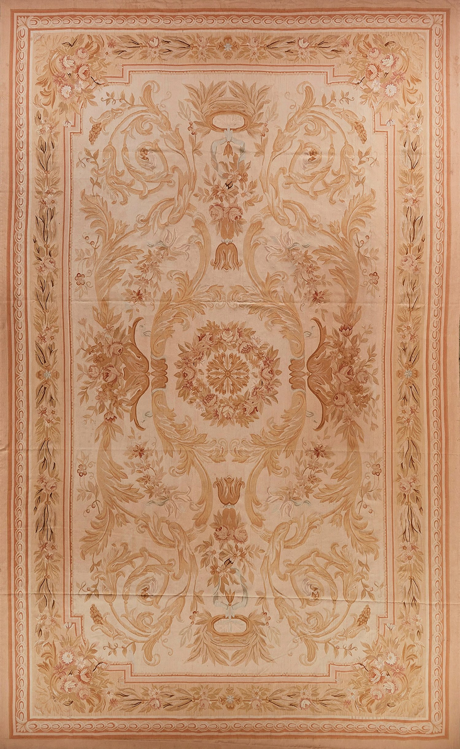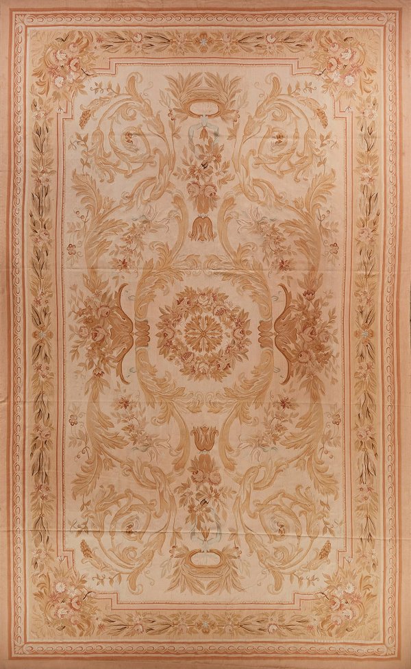 Wolle auf Wolle, flach gewebt. Auf beigefarbenem Fond flächendeckende Musterung aus üppigen, ornamental angeordneten und teilw. eingerollten Blattvoluten und Blütenzweigen in unterschiedlichen Beige- und Cremetönen. Umlaufend breite Bordüre aus Blüten und Blattwerk. 387 cm x 647 cm.