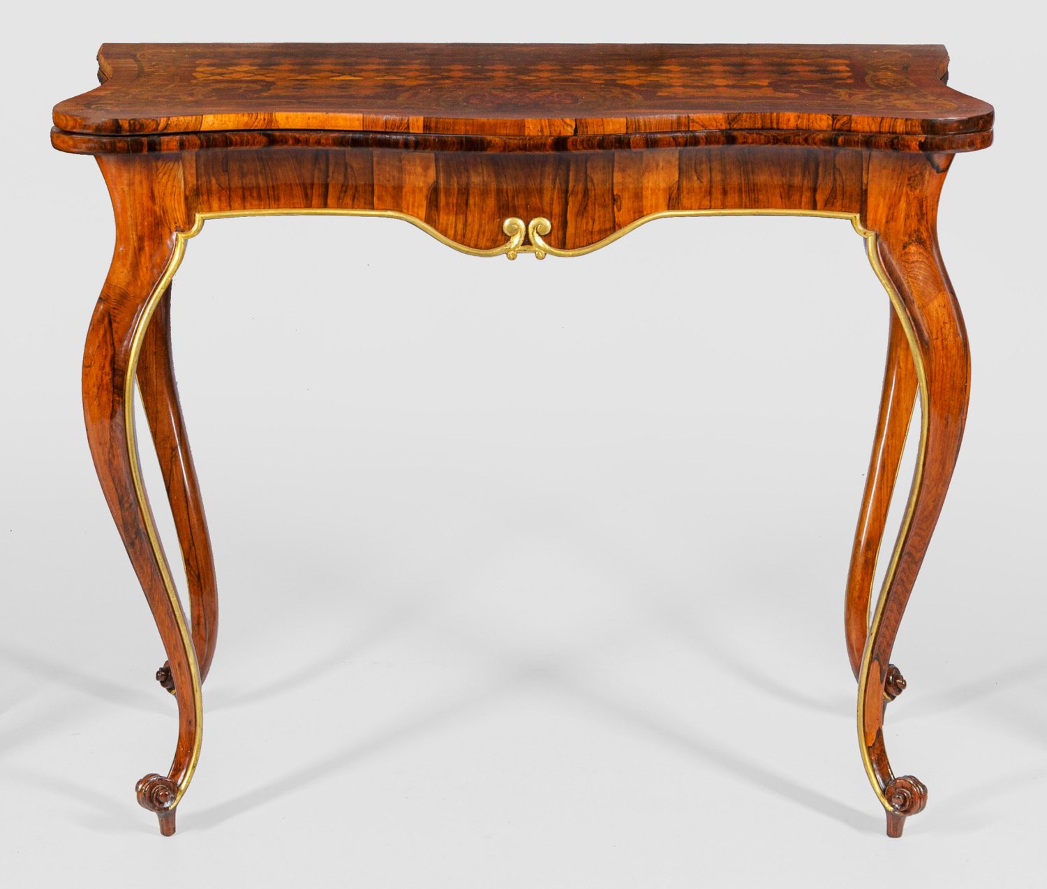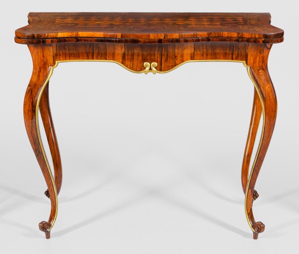 Palisander, furniert sowie Einlagen aus unterschiedlichen Edelhölzern. Konkav eingezogene, rückseitig ausziehbare Zarge auf hohen, stark geschwungenen und sich verjüngenden Volutenbeinen. Passig geschweifte, aufklappbare Deckplatte mit reichen Intarsien aus Volutenmotiven und Gitterwerk. H. 76 cm. 94 cm x 46/92 cm.