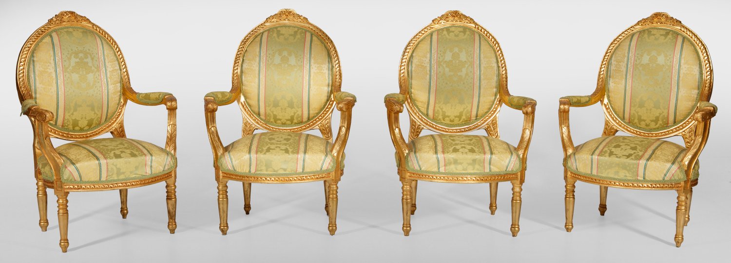 5-tlg.; Canapé und vier Armlehnsessel. Holz, reliefiert und vergoldet. Bombierte Profilzarge auf gegliederten Balusterbeinen. Blattreliefierte Streben für schmale Armlehnen, in gewölbte bzw. medaillonförmige Rückenlehnenrahmung mit Rosenbekrönung übergehend. Gepolstert und bezogen. Altersspuren. Sofa-H. 101 cm. 179 cm x 55 cm. Sitz-H. 42 cm.