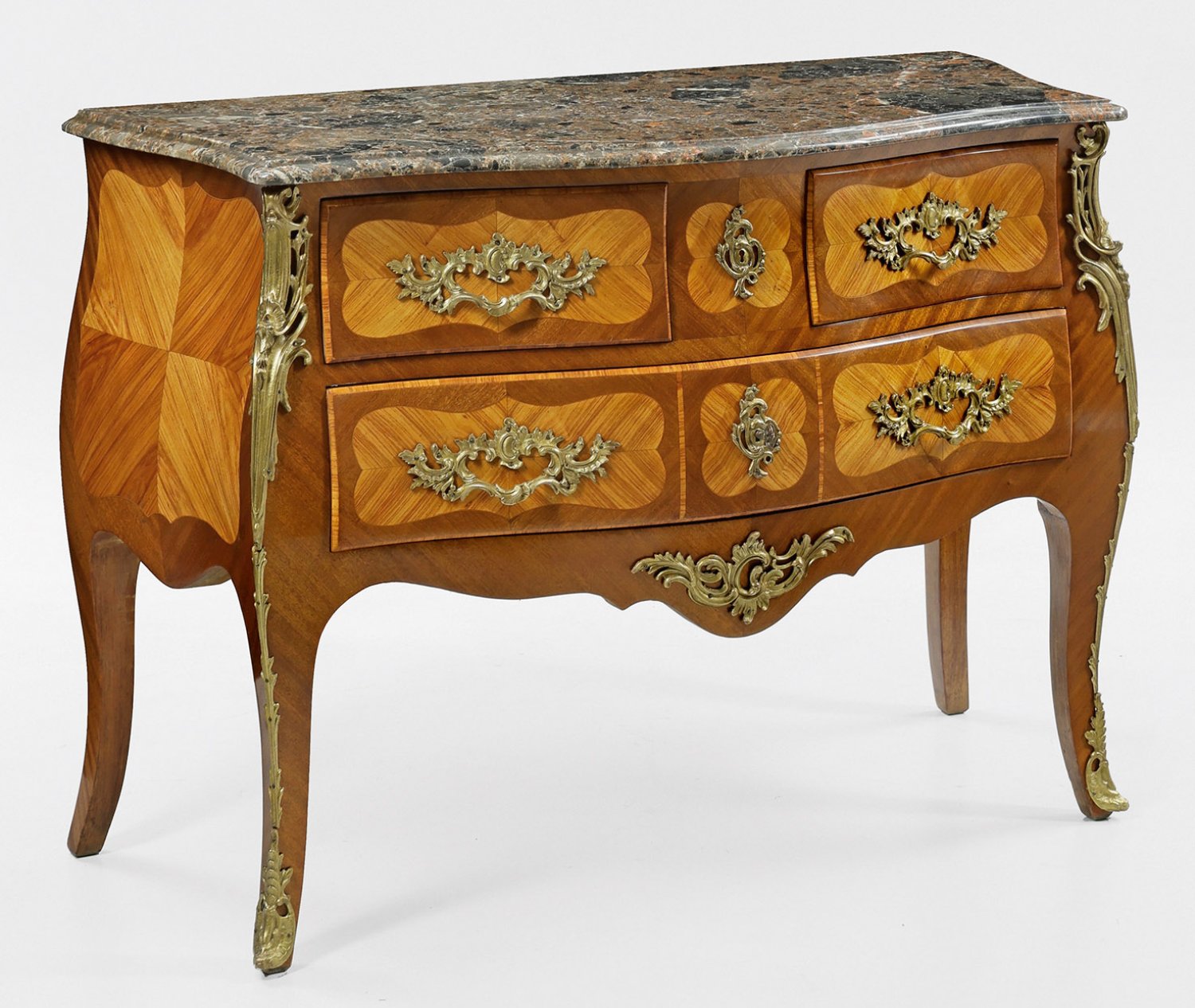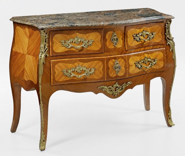 Mahagoni und Rosenholz, furniert. Dreiseitig bombierter Korpus mit passig geschweifter Zarge, flankiert von ausgezogenen Ecklisenen, in leicht ausgestellte Beine übergehend. In der gegliederten Front drei Schubladen unterschiedlicher Größe. Flächendeckend kartuschenförmige, gespiegelt angeordnete, korrespondierende Deckplatte aus grau-braun gemasertem Marmor. H. 84 cm. 121 cm x 54 cm.