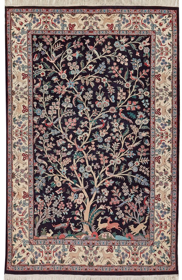 Indien. Wolle auf Baumwolle. Auf schwarzem Fond flächendeckende Paradiesgartenmusterung mit unterschiedlichen Vogelpaaren und Wildtieren. Umlaufend breite, elfenbeinfarbene Bordüre mit korrespondierendem Dekor, flankiert von schmalen Bändern. 283 cm x 184 cm.