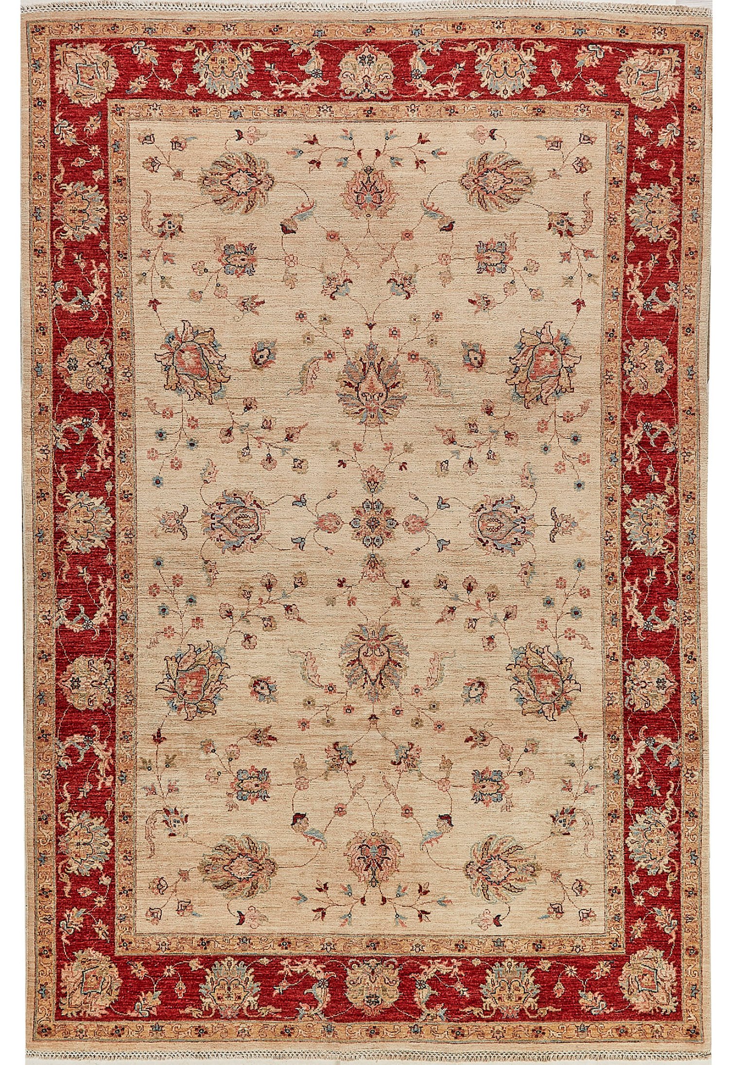 Afghanistan. Wolle auf Baumwolle. Im beigefarbenen Innenfeld großzügige Musterung aus ornamental angeordneten Palmettenranken. Umlaufend rotgrundige Hauptbordüre mit korrespondierender Musterung, flankiert von schmalen Bändern. 297 cm x 197 cm.