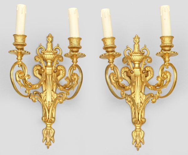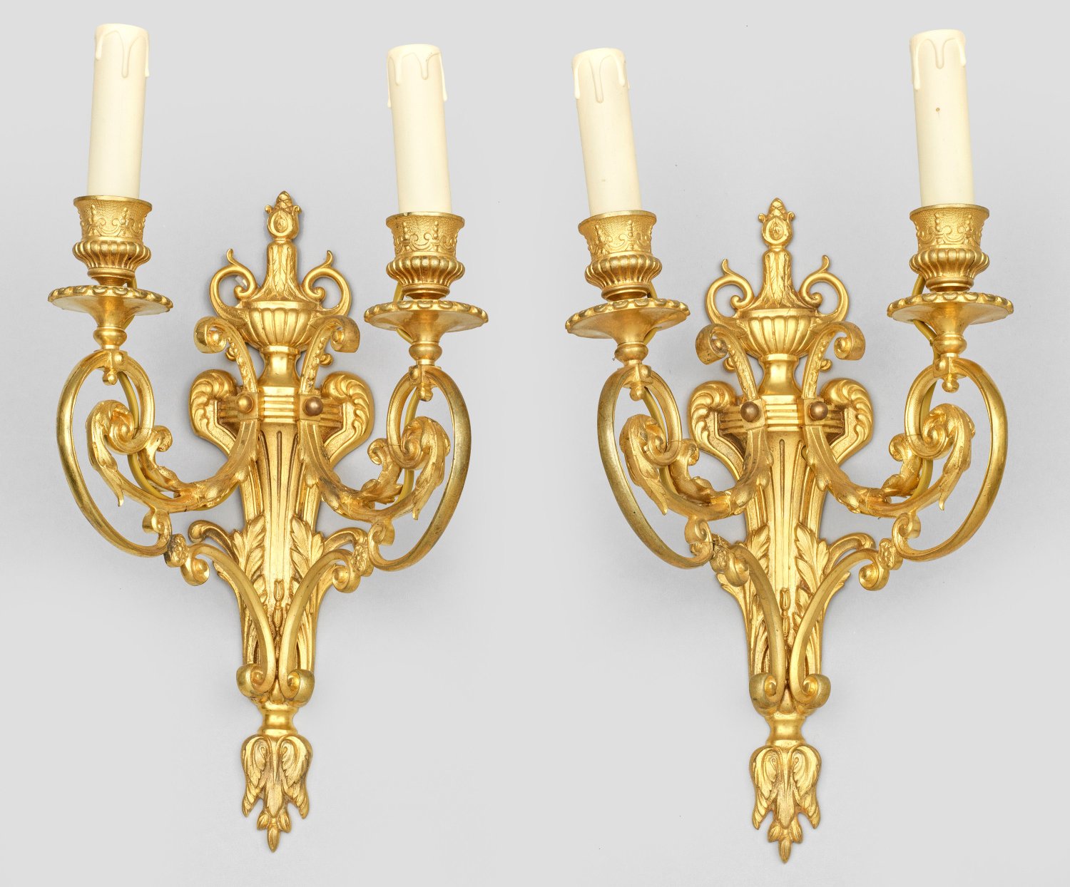 2-flg.; Bronze, vergoldet. Flaches, köcherförmiges Wandschild mit Vasenbekrönung. Davon ausgehend stark geschwungene Leuchterarme aus gegeneinandergestellten Voluten mit vasenförmigen Tüllen als Träger für Leuchtmittel. Elektrifiziert. H. 40 cm.