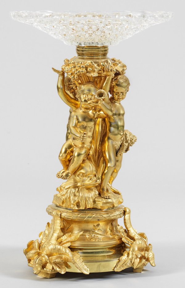 Bronze, vergoldet und farbloses Glas. Über gestuft ansteigendem Sockel auf breiten, balusterförmigen Füßen mit großen reliefplastisch gestalteten Farnblättern sich konisch weitender Schaft sowie drei vollplastisch gestaltete Puttenkinder und großer Delphin als Träger für flach gemuldeten, weit ausschwingenden, flächendeckend facettierten Glasaufsatz. Sign. H.PICARD sowie L.F.; H. 52 cm.