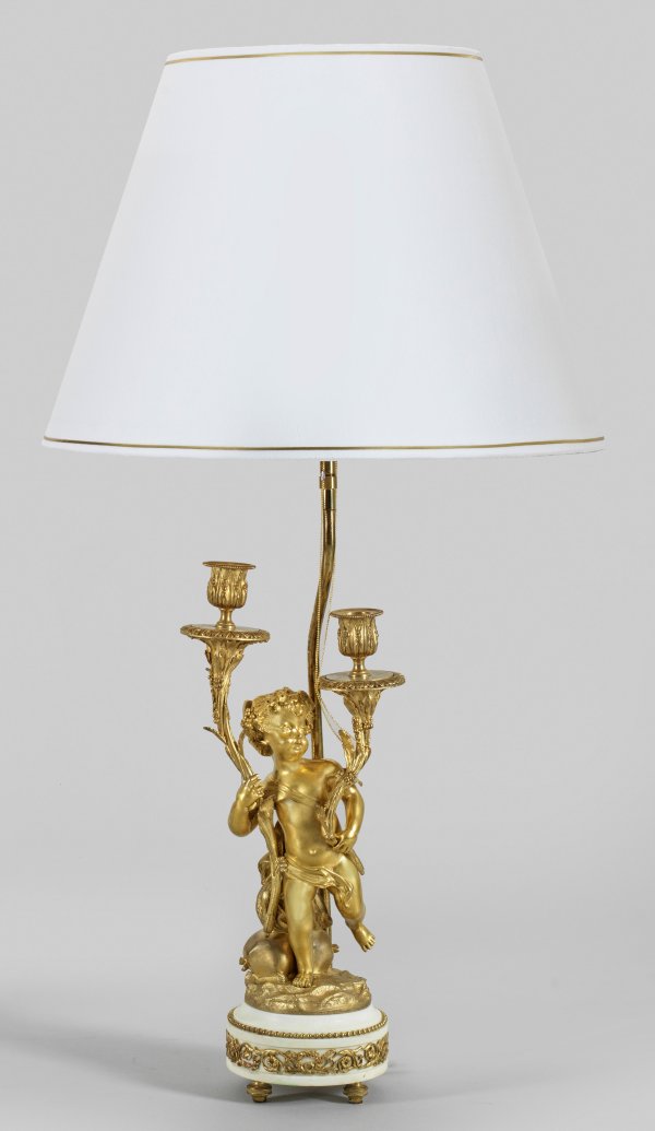 2-flg.; Bronze, vergoldet sowie weißer Marmor. Über profiliertem Rundsockel mit breitem Fries aus Kränzen und Voluten vollplastische Darstellung eines Puttenknaben als Bacchant, zwei geschwungene Leuchterarme mit vasenförmigen Tüllen emporhaltend. Dahinter schlanker Schaft als Träger für Leuchtmittel und konischer Lampenschirm aus weißem Samt. Neuzeitlich als Lampe montiert. Elektrifiziert. H. 86 cm.