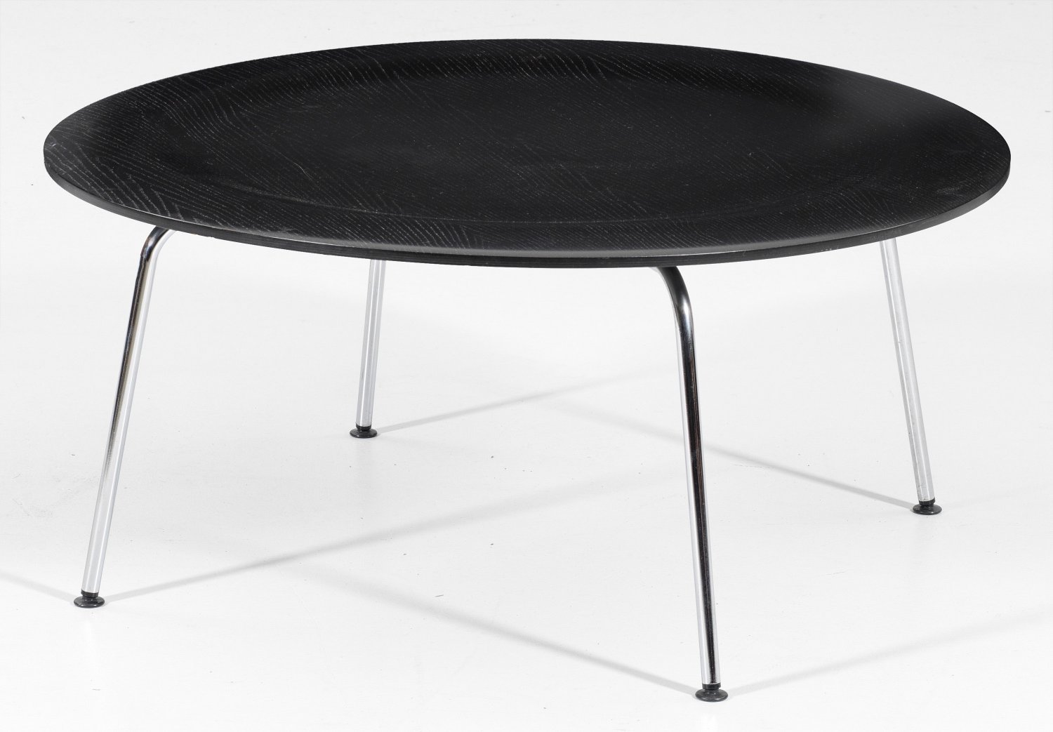 Metall, verchromt und schwarz lackiertes Schichtholz. Gestell aus schräggestellten Rundstäben als Träger für runde, mittig gemuldete Deckplatte. Herstellerzeichen. Entw. Charles & Ray Eames 1945/1946. H. 39,5 cm. D. 86 cm.
