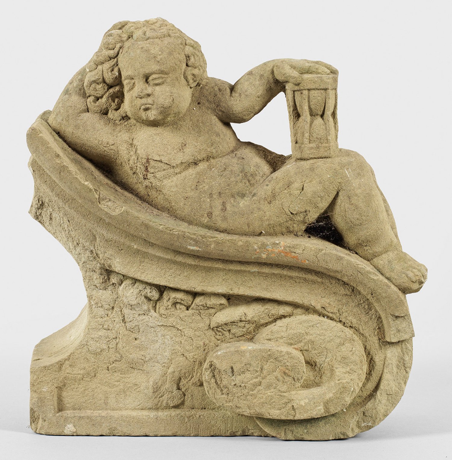 Sandstein. Vollplastische Vanitas- bzw. Memento Mori-Darstellung eines auf einer Volutenspange liegenden Puttos mit dem Betrachter zugewandtem Gesicht, seine linke Hand auf ein auf dem rechten Oberschenkel stehendes Stundenglas gestützt. Besch.; Ca. 36 cm x 36 cm x 14 cm.