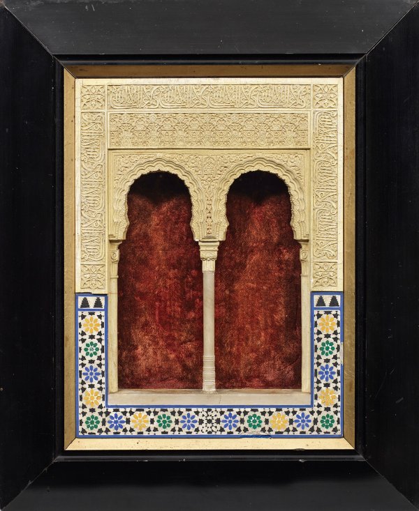 Stuck und Alabaster, polychrom bemalt. Fein reliefplastisch gestaltetes Architekturelement aus der Alhambra in Granada mit maurischem Doppelbogen, zentraler Säule und zwei flankierenden Halbsäulen. Unterhalb die keramische Wandverkleidung mit Sternmuster, darüber die detailreiche Wiedergabe der Ornamente und arabischen Schriftbänder. Ebonisierter Rahmen. Gesamtmaße 43 cm x 35 cm.