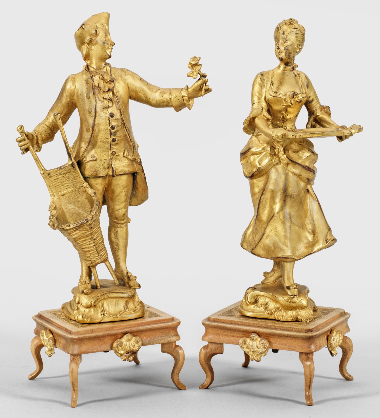 Gegenstücke. Bronze, vergoldet. Ahornholz-Sockel. Jeweils auf einem als Tisch konzipierten Holzsockel stehendes Rokoko-Paar. Elegant gekleideter Herr mit Blumenkorb, in der linken Hand eine Rose überreichend. Als Pendant eine ihm ebenbürtig gekleidete Dame mit Tablett in den Händen, den Blick zum Mann gerichtet. Sehr fein gearbeitete Belle Epoque Goldbronzen von Henri Godet, ein in Paris geborener Bildhauer und Medailleur, Schüler von Math. Moreau, der in der Zeit von 1880 bis 1914 den Salon de Paris mit Büsten, Statuetten, Gruppen und Plaketten beschickte. Sign. "H. Godet", dat. "Salon 1898". Skulpturen-H. 22-23 cm.
