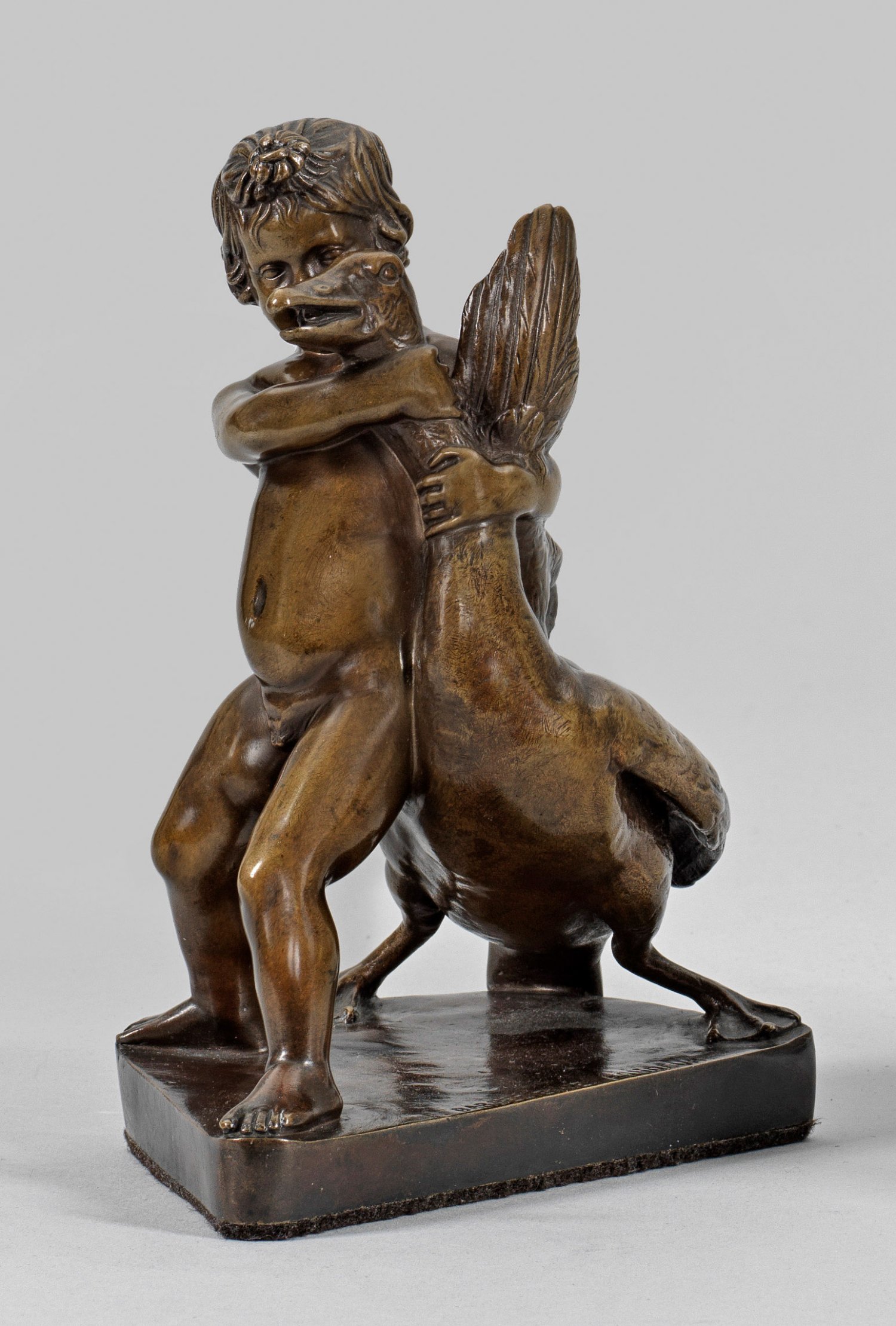 Bronze, dunkelbraun patiniert. Guss des 19. Jhs. von Ferdinand Barbedienne, Paris; bez. "F. Barbedienne Fondeur". Auf einer rechteckigen Plinthe im breiten Kontrapost stehender Putto, eine Gans erwürgend. Darstellung nach der berühmten Marmorkopie eines hellenistischen Bronzeoriginals "Der Ganswürger" in der Glyptothek München. H. 18 cm.