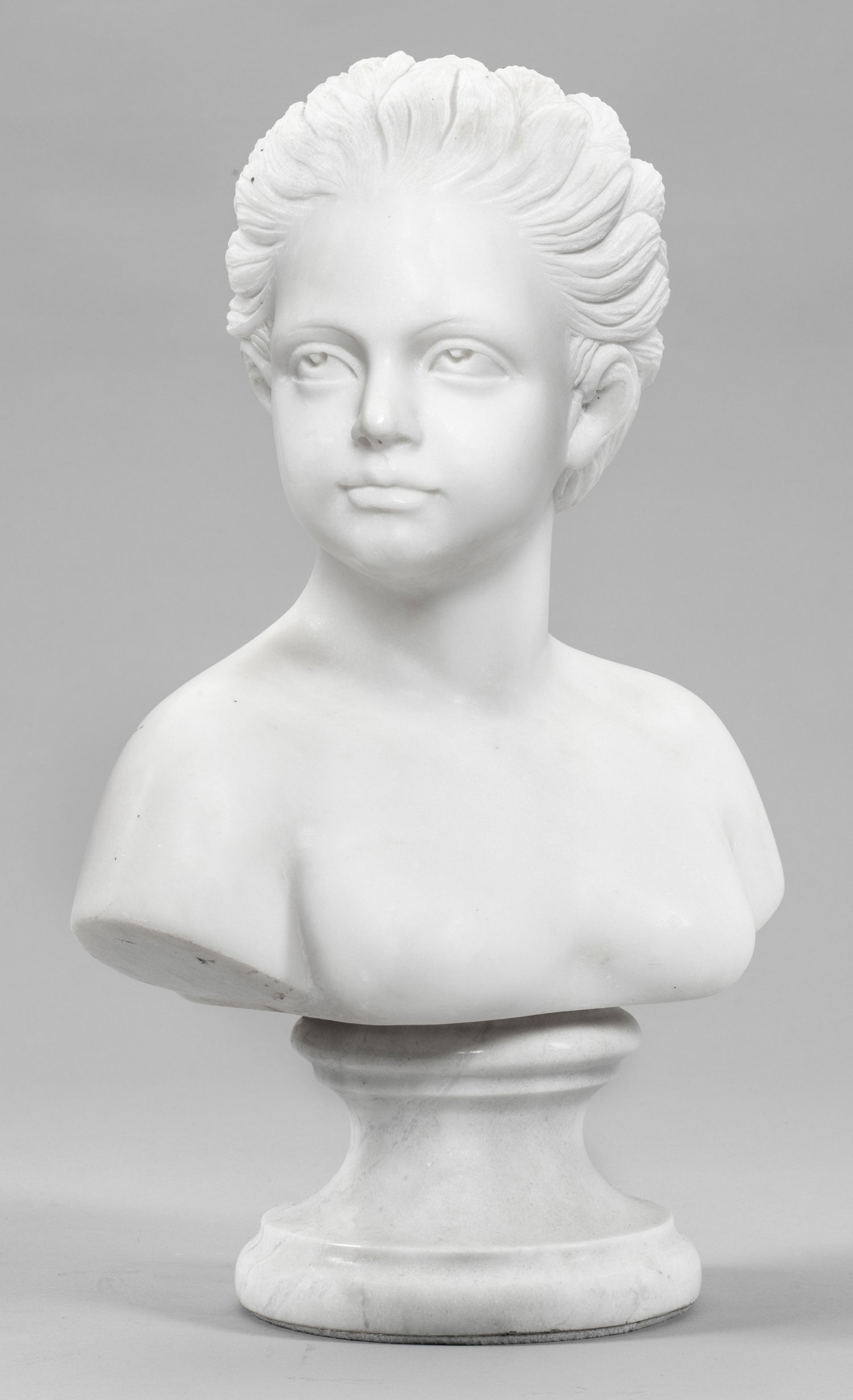Weißer Marmor. Lebensgroße, fein ausgeführte, vollplastische Darstellung eines jungen Mannes bzw. eine Kindes. H. 48 cm.