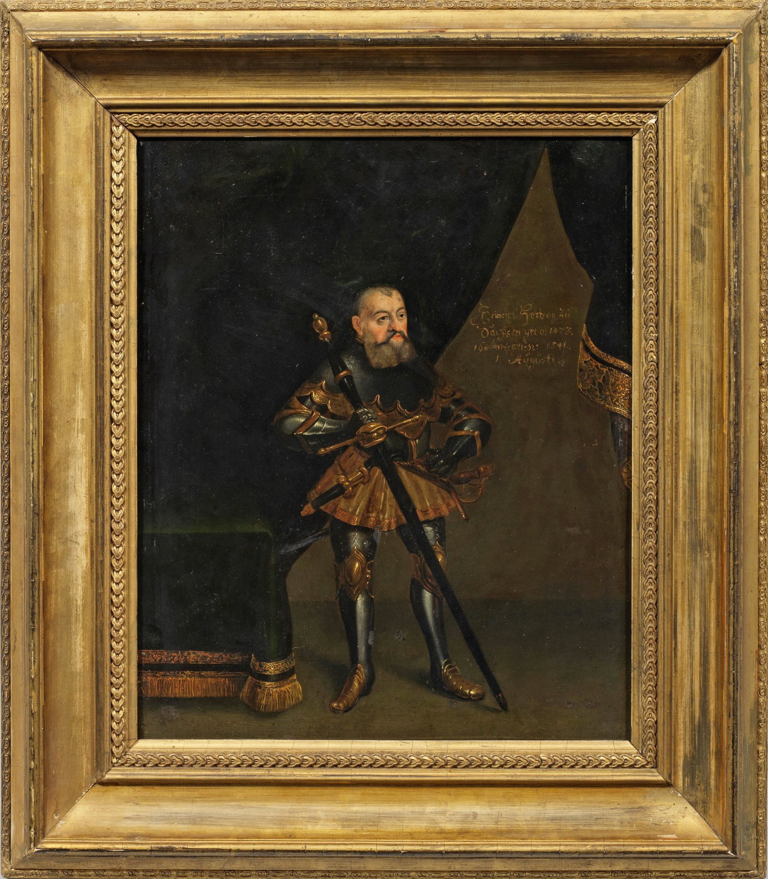 Ganzfiguriges, lebensnahes, charaktervolles Altersbildnis des Herzogs im Halbprofil mit grauem, zu den Seiten ausgefallenem Haar und grauem, eckig geschnittenem, halblangem Vollbart. Geschildert wird er als Feldherr in einem teilvergoldeten Harnisch, Kettenkragen und Rüsthandschuhen, mit der rechten Hand einen sehr großen, ihn fast überragenden Bidenhänder haltend; außerdem trägt er an der linken Seite ein Reiterschwert und an der rechten an goldener Kette einen vergoldeten, in Renaissanceform verzierten Dolch. Der Raum mit einem großen, grün-goldenen Vorhang und einem auf der rechten Seite des Herzogs stehenden Tisch wird beiläufig geschildert, um den Betrachter nicht von der im Bildzentrum stehenden Figur des Herzogs abzulenken. Die begleitende Inschrift mit Lebensdaten weist darauf hin, dass dieses Bildnis kurz nach seinem Tod entstanden sein dürfte: "Heinrich Hertzog zu Sachsen. Geb: 1473. 16. Mart(ius): gestor: 1541. 1 Augusti". Sichtlich beeinflusst und inspiriert wurde das vorliegende Bildnis des Herzogs wahrscheinlich durch in den 1530er Jahren entstandene Porträts von der Hand Lucas Cranach dem Älteren, von denen sich zwei erhalten haben bzw. dokumentiert sind (Wvz. CORPUS CRANACH CC-POR-220-02 und CC-POR-220-08). Vergleichbar ist außer dem Kopf selbst insbesondere die Darstellung des Herzogs in einem Harnisch und Kettenkragen sowie der Bidenhänder. Dieser charakterisiert ihn als Mann des Schwertes, wie er bereits von den Zeitgenossen gesehen werden wollte: "Er behing sich aber gemeiniglich mit großen Wehren zu beiden Seiten als einem Schwerte und einem Dolch, der ihm im Alter schwer zu tragen war, doch ließ er ihn nicht von sich wie denn auch ein Schlacht-Schwert, so er in Friesland gehabt und allezeit in seiner Schlafkammer beim Bette stehen musste (...) und ein Panzer seine Rüstung, ließ sich allewege auch mit solchen Waffen oder Wehren sehen.". (Zit. Adam Friedrich Glafey: "Kern der Geschichte des Hohen Chur- und Fürstlichen Hauses zu Sachsen", Frankfurt 1721, S. 187). Öl/Kupfertafel. 39,5 cm x 31,5 cm. Rahmen.