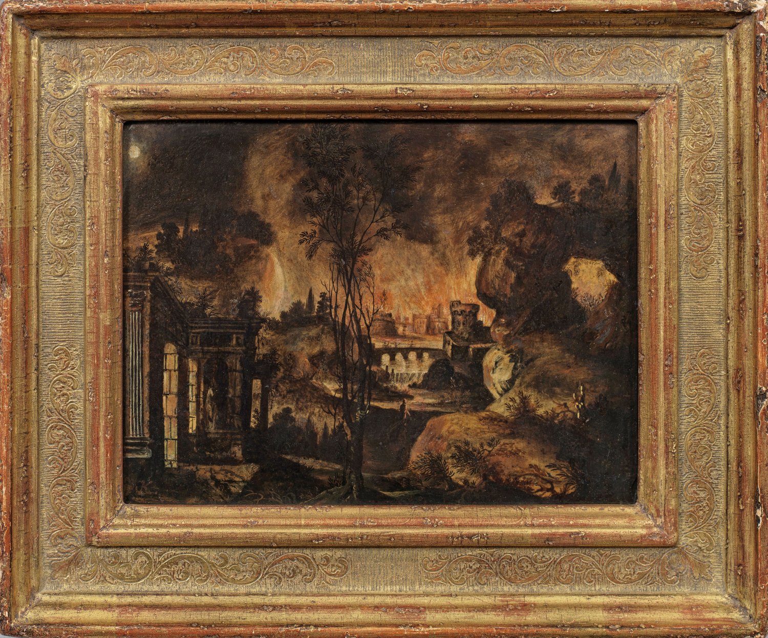 Das wohl einst als Kabinettbild einer fürstlichen Kunstkammer oder eines vermögenden Bürgers ausgeführte Gemälde schildert effektvoll eine nächtliche Szenerie im Mondlicht mit der biblischen Zerstörung der Städte Sodom und Gomorra. Im Vordergrund ist auf der linken Bildseite eine Palastarchitektur dargestellt, gegenüber ein bizarrer Felsenbogen, dessen Durchbruch einen Blick auf das Inferno freigibt; in der Bildmitte wird der Blick des Betrachters tief auf Festungsarchitekturen und eine große Steinbrücke gelenkt. Stilistisch zeigen sich gewisse evidente Bezüge zu Werken aus den südlichen Niederlanden bzw. von flämischen Künstlern; zu nennen wären hier u. a. Herri met de Bles (um 1500/10 - 1560), Gillis Mostaert (1528 - 1598) und Kerstiaen de Keuninck (1561 - 1635). Durch Handelsbeziehungen, Reisen und den 1576-1612 regierenden, kunstsinnigen Kaiser Rudolf II. standen die Künstler in regem internationalen Austausch, so dass Einflüsse und Inspirationen weithin gelangten. Öl/Steintafel (wohl Solnhofener Stein). L. u. Monogr. "K".18 cm x 24,5 cm. Rahmen.