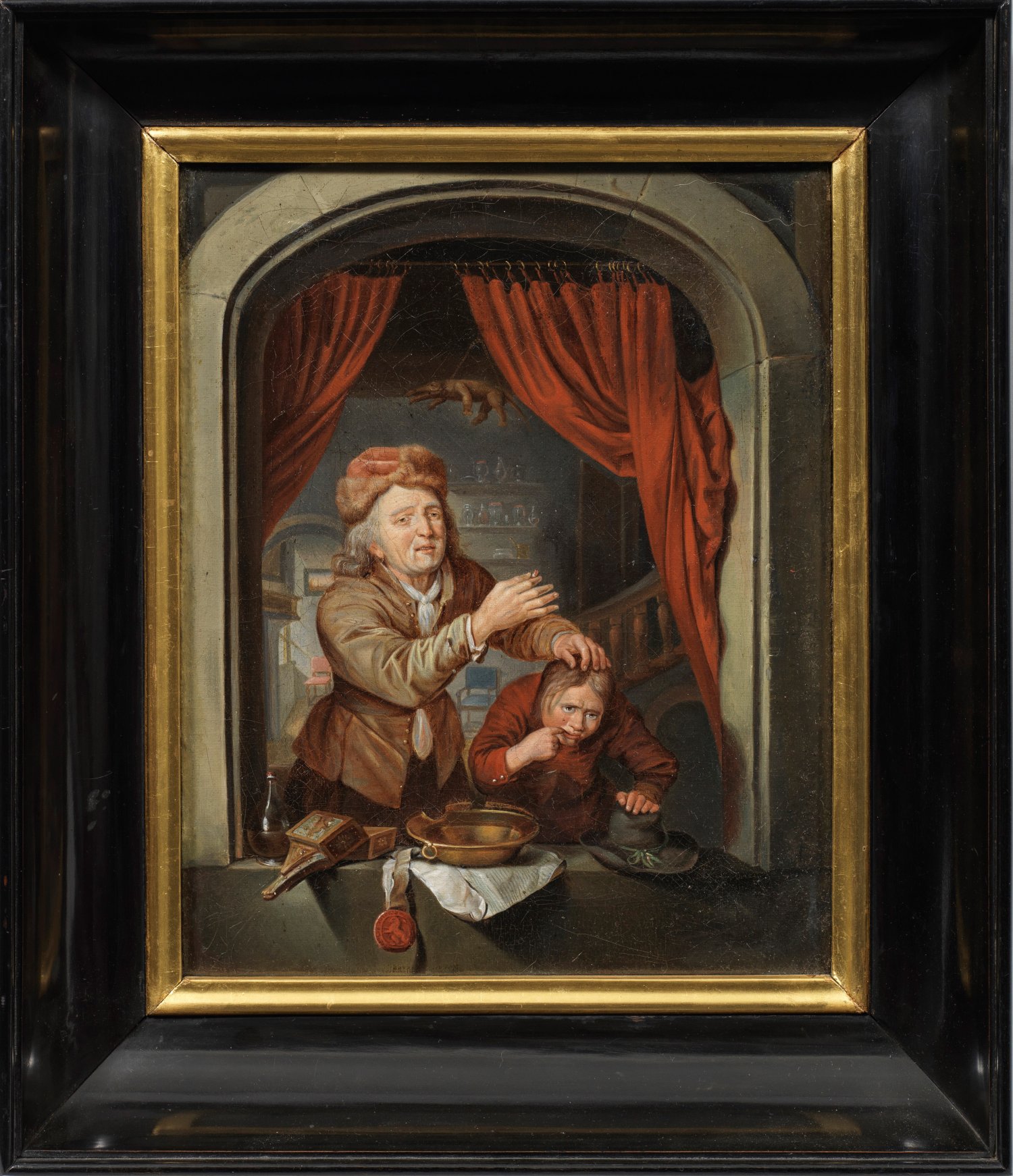 Das bühnenartig komponierte Genrebild gibt einen detailreichen Einblick in das Arbeitsleben eines Zahnarztes der damaligen Zeit. Künstlerisch qualitätvolle, minutiöse Kopie des 18./19. Jhs. nach dem berühmten, 1672 entstandenen Genrebild des bedeutenden Leidener Barockmalers in der Gemäldegalerie Alte Meister der Staatlichen Kunstsammlungen in Dresden (Inv.-Nr. Gal.-Nr. 1710). Öl/Lwd.; Mittig unterhalb unleserlich sign. und dat.; Partiell hinterlegt und ger. retuschiert. Ca. 32 cm x 25 cm. Rahmen.