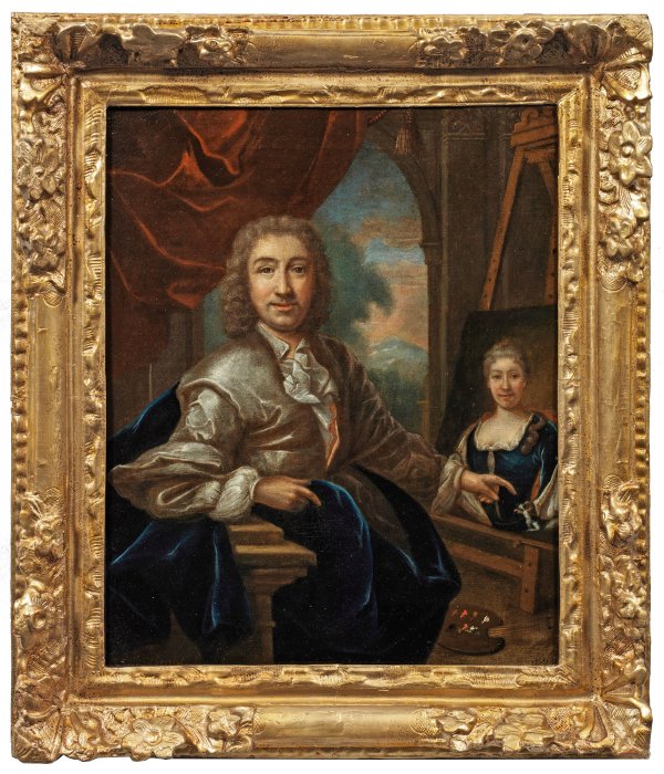 Feinflüssig gemaltes Werk, wohl ein Selbstbildnis des Künstlers, der in seinem Atelier sitzt, sich nach rechts dem Betrachter zuwendet und zugleich auf das höfische Porträt einer Dame deutet, welches auf der Staffelei steht. Hierbei zeigt sich der zu Wohlstand und Ansehen gekommene Maler durchaus selbstbewusst, wie er es durch die seidene Kleidung und den blauen Mantel anschaulich zum Ausdruck bringt. Dem entspricht der große, rote, zur Seite gezogene Vorhang, welcher den Blick auf einen Landschaftshintergrund mit lebendig bewölkten Himmel freigibt. 41,5 cm x 34 cm. Öl/Lwd., doubl.; L. u. sign.; Rahmen.
