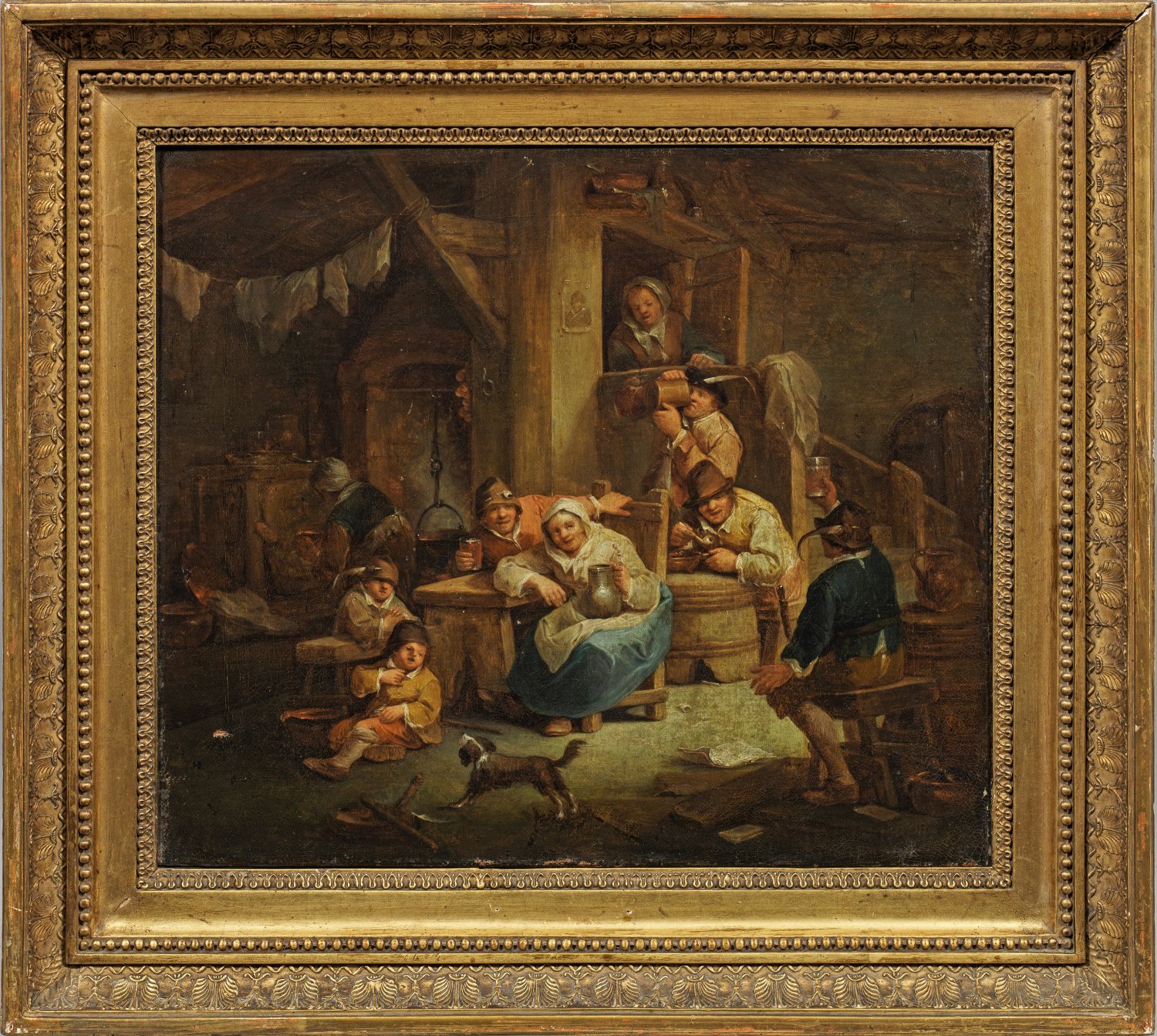 In tonigem Kolorit gemalte Genreszene, bei der die Ausgelassenheit des Gelages außer in Charakterisierung der bäuerlichen Figuren auch in den auf dem Boden liegenden Gegenständen, dem Hund und den zwei dem Treiben beiwohnenden Kindern zum Ausdruck kommt. Motiv und Stil zeigen evidente Parallelen zu bekannten Werken Trautmanns mit vergleichbaren Motiven. Sein vielfältiges Oeuvre umfasste neben biblischen Motiven, Feuersbrünsten sowie Charakter- und Studienköpfen in der Nachfolge Rembrandts insbesondere derartige Genredarstellungen. Hierin spiegelte sich der prägende Einfluss der niederländisch-flämischen Malerei des 17. Jhs. - von Adriaen Brouwer, David Teniers und Adriaen van Ostade - wider. Öl/Lwd., doubl.; Am rechten Bildrand auf dem Fass monogr.; 37 cm x 43 cm. Klassizistischer Rahmen.