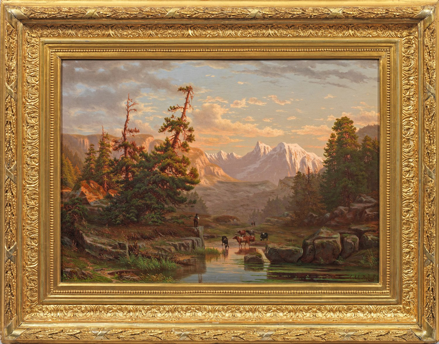 Vor sanft beleuchteter alpiner Kulisse und unter harmonischem Wolkenspiel öffnet sich die malerische Landschaft, in deren Vordergrund eine Kuhherde an einer Tränke rastet. Nijhoff, der Schüler v. Hendrikus van de Sande Bakhuyzen war, schuf überwiegend alpine und Schwarzwälder Landschaften, die er den Eindrücken seiner Studienreisen entlehnte und mit äußerster Detailtreue und feinem Duktus wiedergab. Öl/Lwd.; R. u. sign.; Verso schwer leserl. bez. "Landschaft (…) Schweiz (...)". 58 cm x 82 cm. Rahmen.