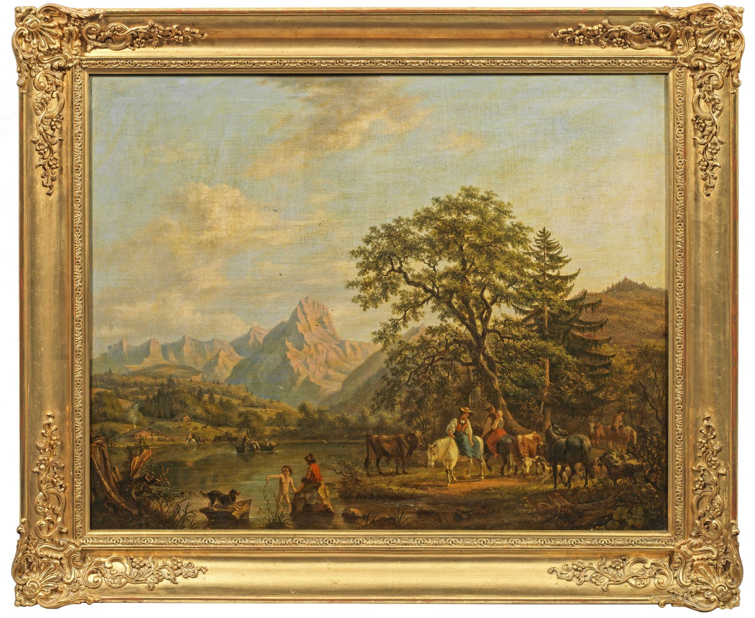 Spätromantische, atmosphärisch gestimmte Darstellung eines wohl in der Schweiz gelegenen, sommerlichen Alpensees. Im Vordergrund wird die Landschaft belebt durch eine reiche, lebendig wiedergegebene Staffage aus badenden Bauernkindern mit ihrem Hund, auf der rechten Seite aus rastenden jungen Bauern und Bäuerinen zu Pferde als Hirten mit ihrer Kuhherde; auf dem See holen Fischer in ihrem Boot das Netz ein, während am anderen Ufer ein weiterer berittener Hirte zu sehen ist. Öl/Lwd.; L. undeutl. sign.; 73 cm x 93 cm. Wohl Original-Rahmen.