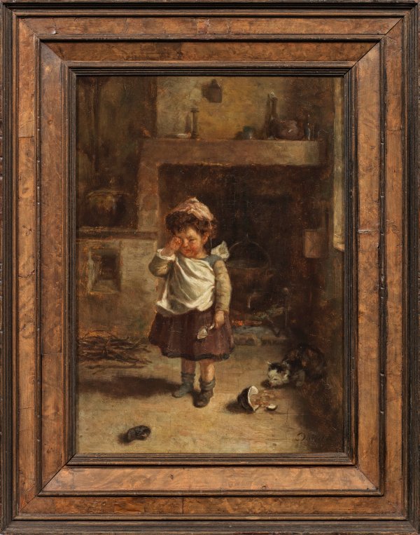 Erzählerische, anrührende Genreszene in einem bäuerlichen Interieur mit einem jungen, traurigen Mädchen, das eine Schale zu Boden fallen ließ, dessen Inhalt nun eine Katze genießt. In Motiv und Stil typisches Werk des französischen Malers, der auf Darstellungen aus der Welt der Kinder spezialisiert war. Dargelas studierte an der Ecole des Beaux-Arts de Paris. Seit 1850 waren seine Arbeiten in Großbritannien, nach einer begeisterten Kritik des englischen Kunstkritikers John Ruskin, besonders erfolgreich. 1857 begann er, seine Werke auch im Pariser Salon auszustellen, wo er ebenfalls große Erfolge erzielen konnte. Öl/Holztafel. R. u. sign.; 31 cm x 23,7 cm. Rahmen.