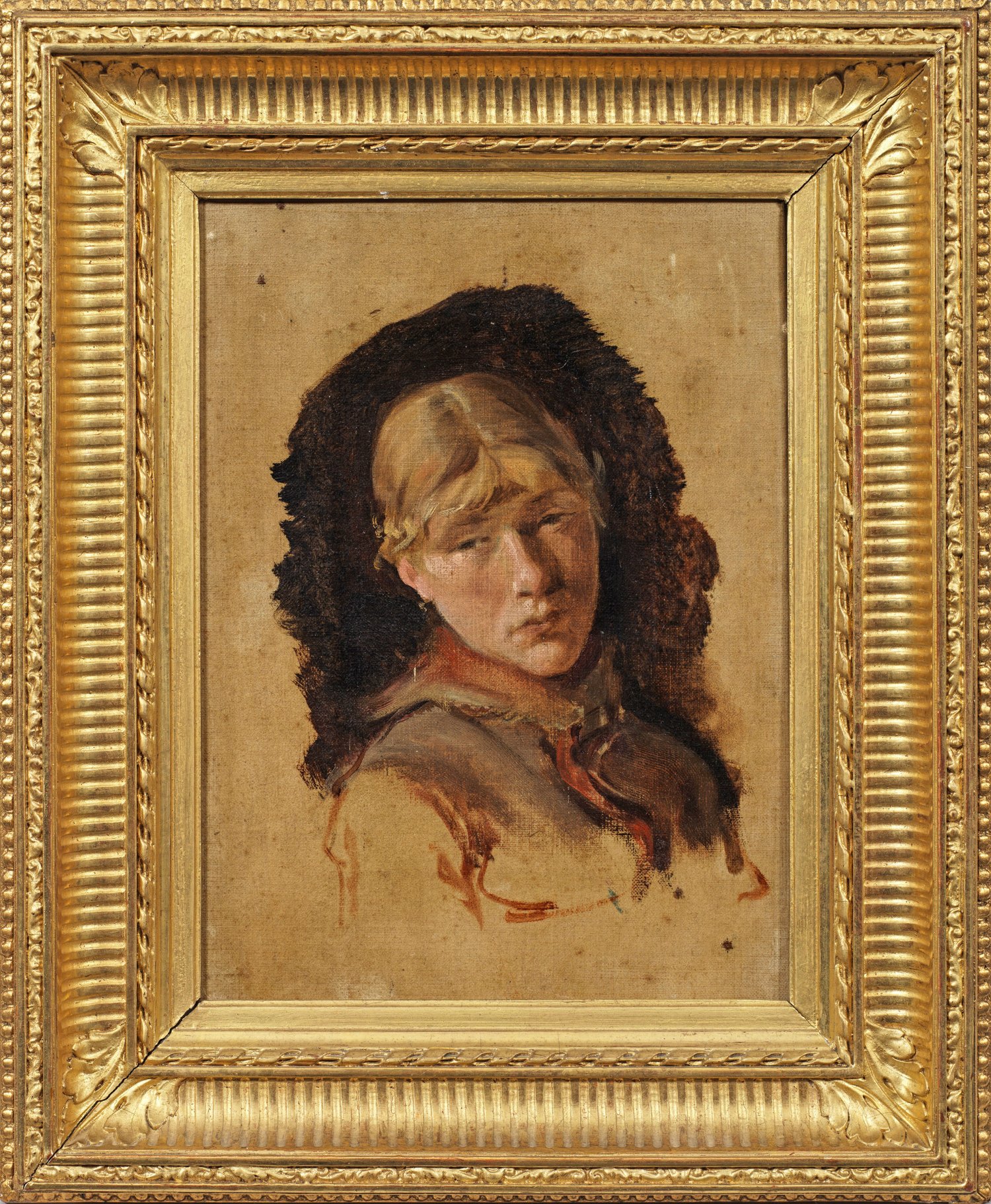 Das realistische, lebensnahe Porträt ist ganz auf den Kopf des Mädchens konzentriert, den sie zur Seite neigt und en face dem Betrachter zuwendet, während ihr Oberkörper im Halbprofil geschildert wird. Der Kopf ist hierbei effektvoll vor eine kleine, ovale dunkle Fläche komponiert, während große Teile des hellen Bildgrundes unbemalt blieben. Banti war vor allem als Genre- und Landschaftsmaler tätig und gehört zu den bedeutenden Künstlerpersönlichkeiten der Macchiaioli-Bewegung in der Toskana. Öl/Lwd.; Verso handschriftliche Echtheitsbestätigung, wohl eigenhändig vom Künstler. 21,8 cm x 16 cm. Rahmen.