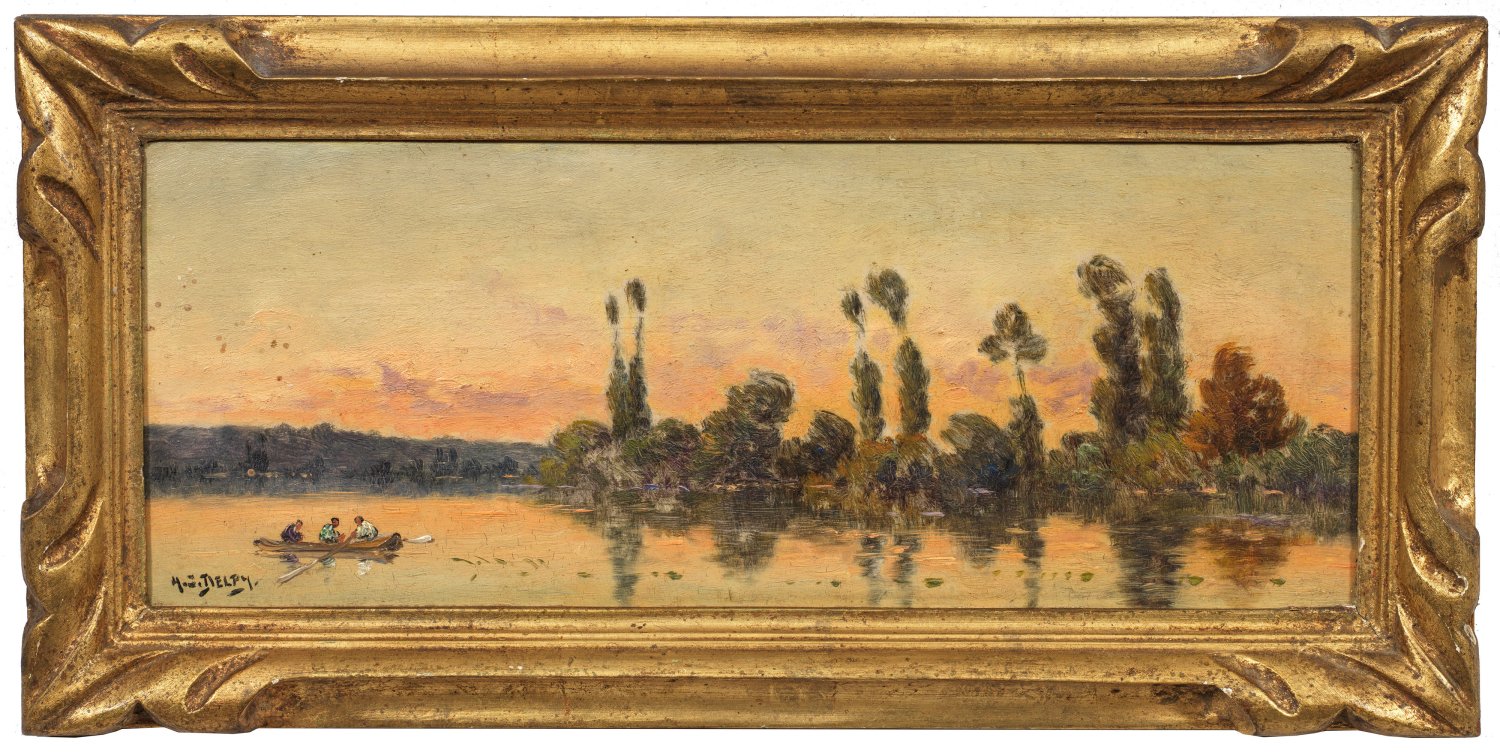 Motiv- und stiltypische, impressionistische Landschaft Delpys, der zur Schule von Barbizon gehörte, bei Daubigny lernte und von Corot gefördert wurde. Als Zeitgenosse der Impressionisten, befreundet mit Pissarro und Cézanne, entwickelte Delpy einen lockeren Duktus für seine Motive aus dem Wald von Fontainebleau, aus der Normandie, von der Seine, Yonne und Oise. 1869 debütierte Delpy auf dem Salon, wo er ab 1873 regelmäßig ausstellte. Öl/Holztafel. L. u. sign.; 13 cm x 33 cm. Rahmen.