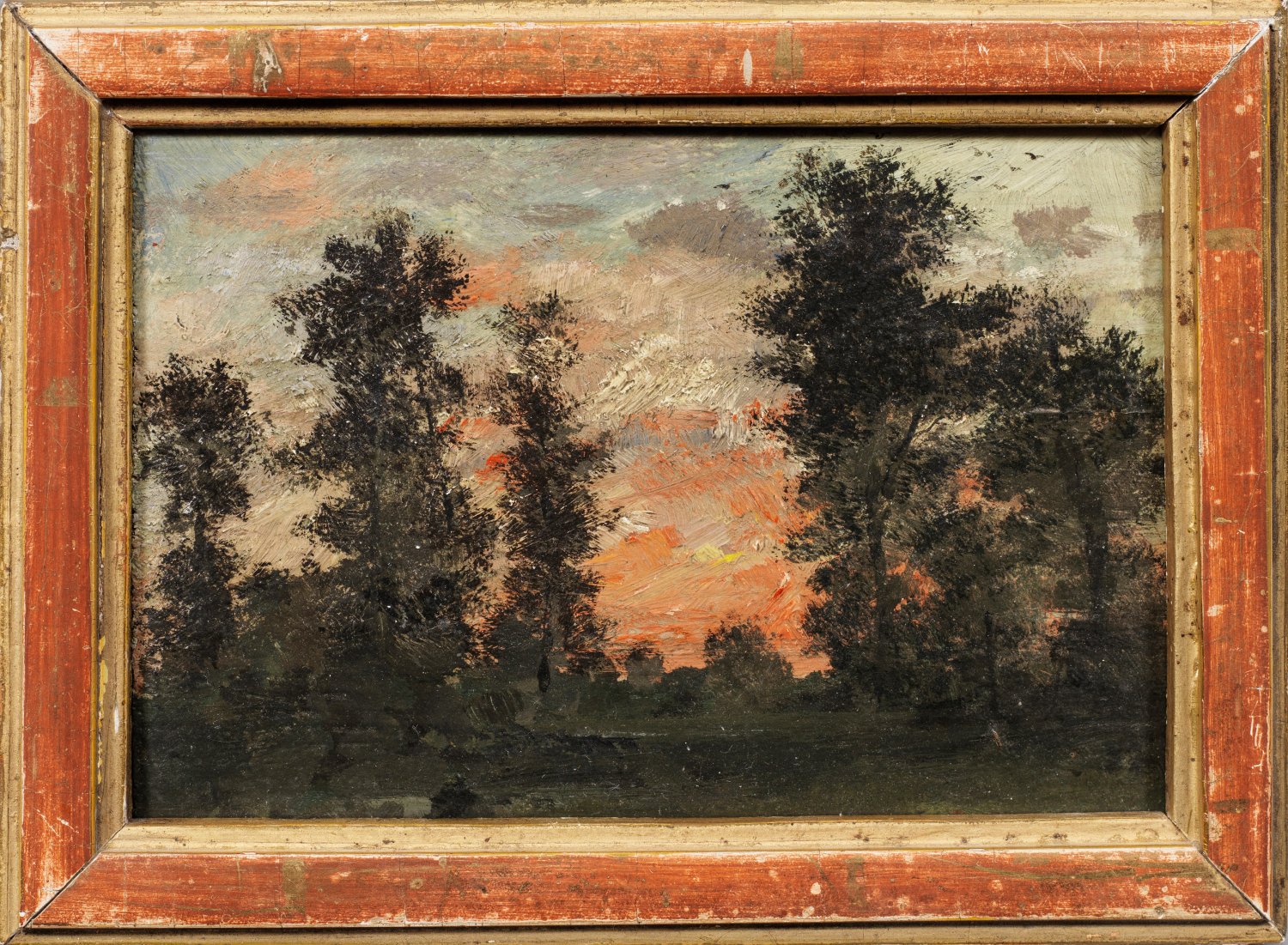 Attributed to Théodore Rousseau (1812 - 1867). Oil on panel. Signed or inscribed "TH. ROUSSEAU" on the reverse.