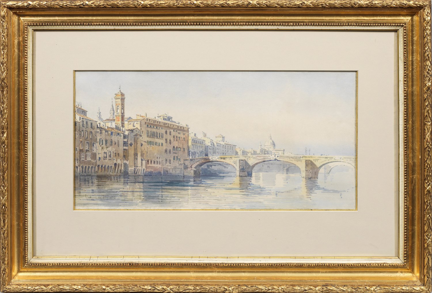 Blick von der Ponte Vecchio bzw. vom Lungarno degli Acciaiuoli auf die Ponte Santa Trinita, den Arno und die Stadt. Typische, in lichten Tönen gehaltene, atmosphärisch gestimmte Vedute Giallinas. Der bedeutende griechische Aquarellmaler studierte in Venedig, Neapel und Rom; 1878 kehrte er nach Korfu zurück. Im Auftrag des britischen Botschafters und des europäischen Adels bereiste er außer Griechenland viele andere Mittelmeerländer, u. a. Italien, Frankreich und Konstantinopel. Neben Gruppenausstellungen wurde er ab 1886 auch durch Einzelausstellungen bekannt, die ihm insbesondere in England große Popularität eintrugen. 1900 nahm er an der Weltausstellung in Paris teil. Aquarell/Papier. L. u. sign. u. dat. (18)89 mit Ortsangabe Florence. 31,5 cm x 64 cm. Rahmen.