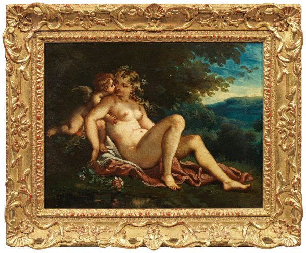 Unter einem kräftig-grünen Busch in sich weit öffnender Landschaft liegt die unbekleidete Schönheit, als Allegorie der antiken Liebesgöttin, auf einer wallenden Draperie und in inniger Geste mit Ihrem Begleiter in Gestalt eines geflügelten Knaben. In Sujet und Stil typisches Werk des französischen Malers, der 1851 im Pariser Salon debütierte. Öl/Holzplatte; R. u. sign. "Chassevent Charles". 26,5 cm x 35 cm. Rahmen.