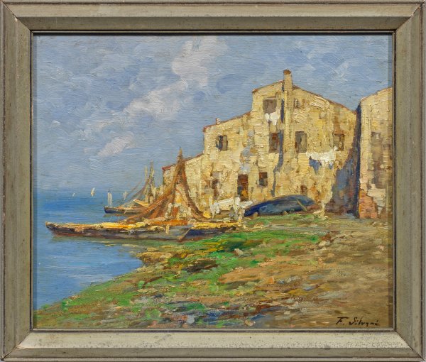 Attributed to Ferdinando Silvani (1823 - 1899). Oil on plywood panel. Signed. Titled on the reverse, further a label with dedication by a foreign hand, dated 1943.