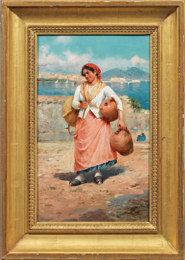 In pastelltonigem, subtil nuanciertem Kolorit gemalte, süditalienische Genreszene mit subtil charakterisierter Italienerin vor belebter Küste mit Ansicht des Vesuvs. Giardiello verband in seinen Gemälden naturalistische und impressionistische Stilelemente. Die Motive für seine Porträts, Alltagszenen und Küstenlandschaften, oft mit Fischern und Kindern, fand er vornehmlich auf Capri. Öl/Lwd.; R. u. sign.; 39,5 cm x 25 cm. Rahmen.