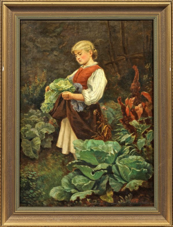 Szenische Darstellung eines inmitten großer Kohlköpfe stehendes, ganz in sich versunkenes Mädchen, mit beiden Händen ihr rotes Kleid vor den Bauch gehoben, um ihre Ernte zu tragen. Realistisches, wohl um 1870-1880 entstandenen Genrebild, dessen Reiz und Stimmungsgehalt vor allem von der feinfühligen Darstellung der Figur herrührt. Öl/Lwd.; 59 cm x 43 cm. Rahmen.