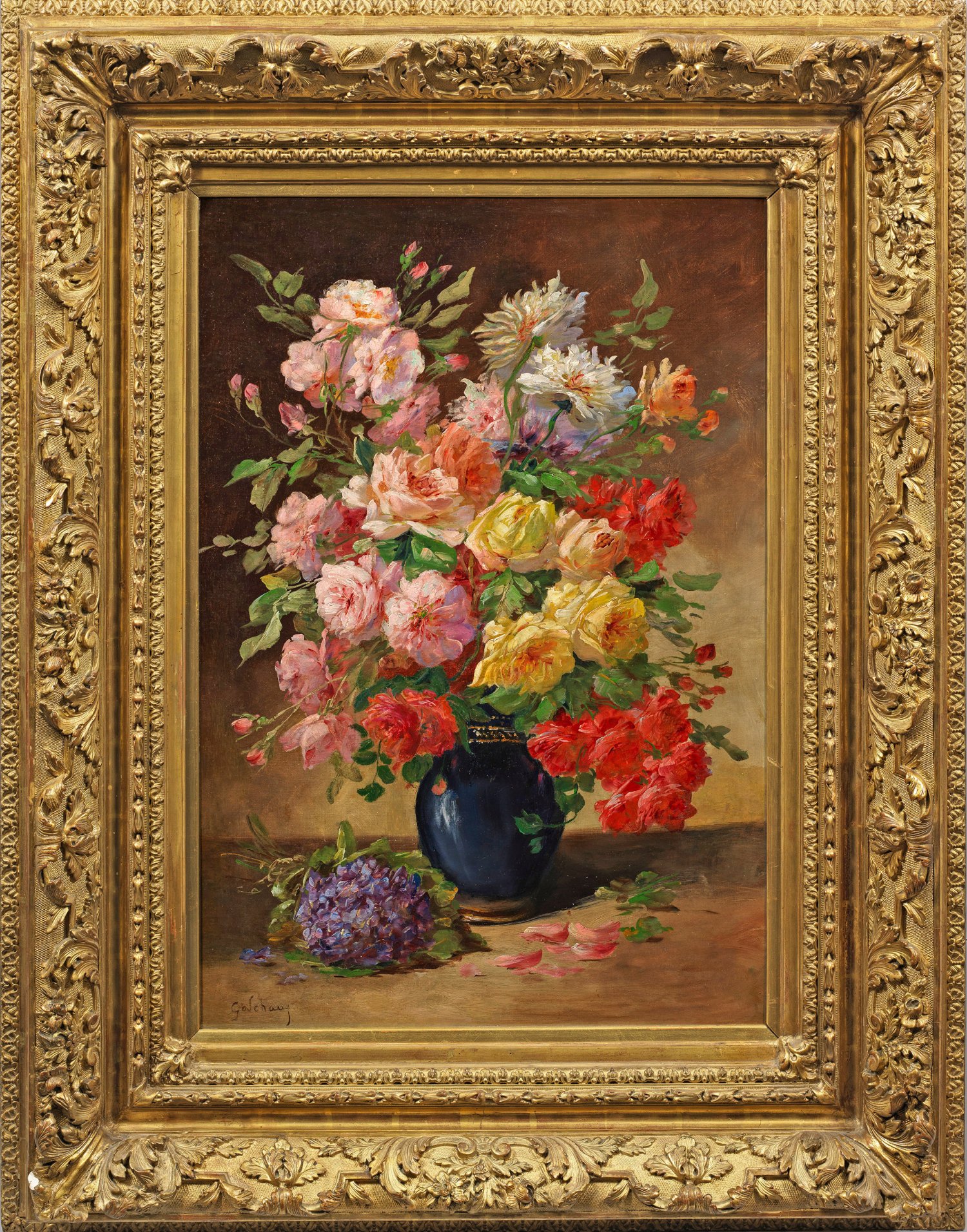 In einer dunkelblauen Vase arrangierter, opulenter Strauß aus unterschiedlichen, leuchtend farbigen Rosen, auf der Platte einige herabgefallene Blütenblätter und ein Veilchenstrauß. Virtuos gemaltes Stillleben, dessen duftige Blüten mit effektvollen Lichthöhungen impressionistische Wirkungen erzielen. Die künstlerisch delikat gemalten Werke von Emile Godchaux werden oft mit denen von Alfred Godchaux (1835 - 1895) verwechselt. Dieser war vermutlich sein Vater, ebenso wie von den zwei weiteren Malern Roger Godchaux (1878 - 1955) and Henri Godchaux (1881 - 1919). Öl/Lwd., doubl.; L. u. sign.; 92 cm x 65 cm. Wohl Original-Rahmen.