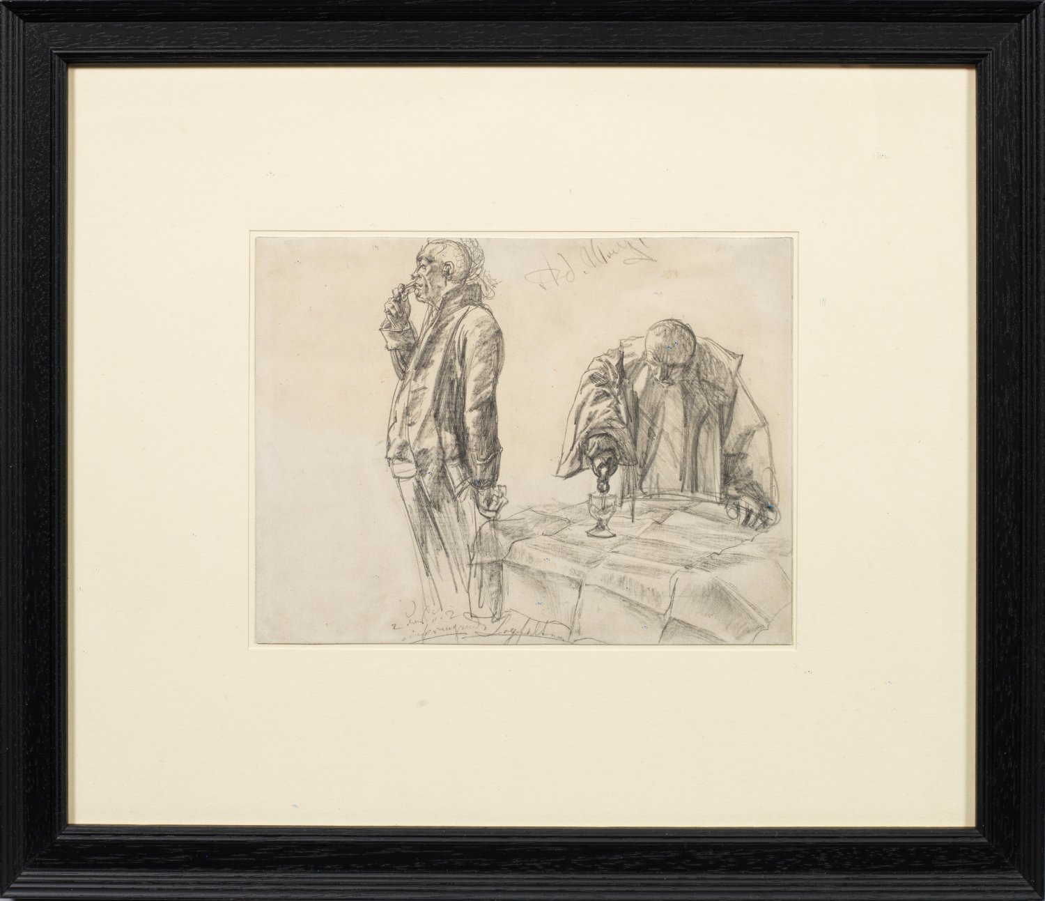Die Zeichnung Menzels ist eine Studie für eine Holzschnittillustration zu der 1877 in Berlin erschienenen, vom Künstler illustrierten, berühmten Prachtausgabe "Der zerbrochene Krug" von Heinrich von Kleist. Dieses "Lustspiel", geschrieben 1802-1806, aufgeführt erstmals 1808 und im Todesjahr des Dichters 1811 erstmals vollständig gedruckt, ist zweifellos das bekannteste Werk des Autors. Ohne die gesamte und ziemlich komplexe Geschichte des Stücks nachzuerzählen, dreht sich die Erzählung um die Bemühungen des Dorfrichters Adam, die Zuneigung der jungen Eva zu gewinnen, deren Mutter jemanden wegen eines zerbrochenen Kruges auf Schadensersatz verklagen will. Dorfrichter Adam muss nun über eine Tat zu Gericht sitzen, die er selbst beging und zugleich den Fortgang dieses von ihm geleiteten Gerichtsverfahrens hintertreiben. Erschwerend kommt hinzu, dass an diesem Morgen ein Gerichtsinspektor namens Walter die Führung der Dorfgerichte überwacht. Der Holzschnitt, für den diese lebhafte und charakteristische Zeichnung eine Studie ist, leitet als Illustration den zehnten Auftritt des Stücks ein, in dem sich der Dorfrichter Adam nach einer Prozesspause zunehmend in Widersprüche verstrickt. Auf der rechten Seite der Zeichnung schildert Menzel den Dorfrichter Adam, wie er dem Gerichtsrat Walter großzügig Rheinwein in ein Glas einschenkt. Diese Figur erscheint in einer nur wenig abweichenden Version auch im gedruckten Holzschnitt. Menzels Anmerkung am unteren Rand des Blattes bezieht sich offenbar auf die Art und Weise, wie er die effektvollen Falten in der Tischdecke darstellen wollte. Schwarze Kreide u. Bleistift/Papier. M. o. sign.; M. u. vom Künstler bez. "2 aus u. 2 einspringende Legfalten". 18,2 cm x 24,4 cm. Rahmen.
