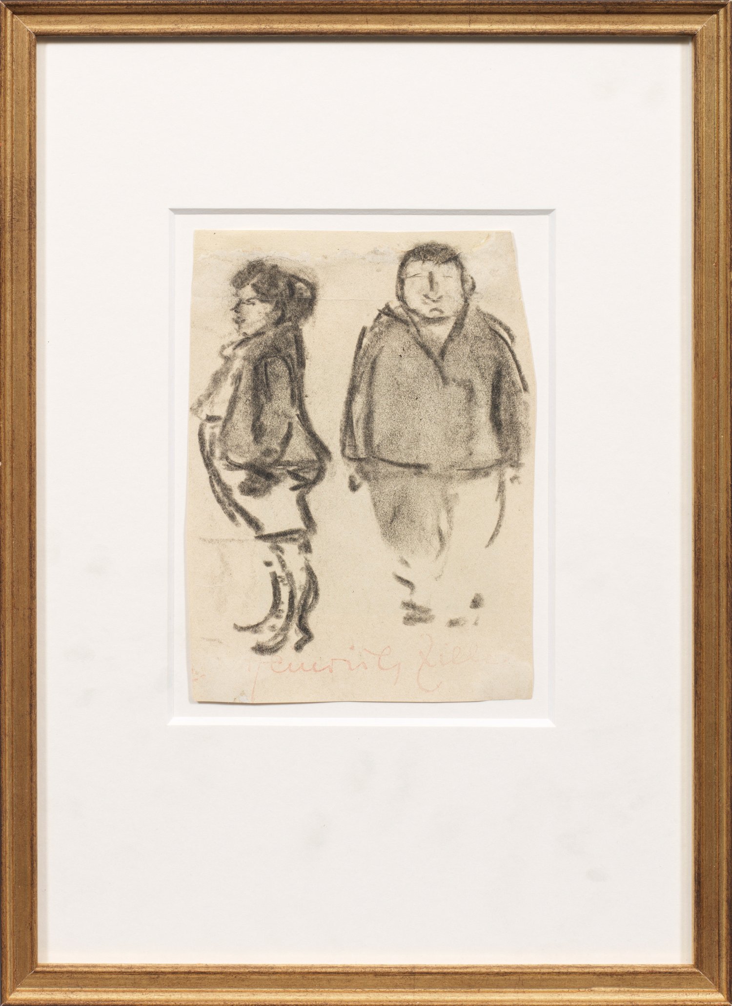 Dynamische Studie eines frontal dargestellten Mannes neben einer Dame im Profil. Kohle/Papier; Unten sowie verso mit Nachlass-Stempel "Heinrich Zille" in Rot (Lugt 2676b, Rosenbach 1); Auf beiliegendem Bl. Nachlass-Stempel in Rot "Nachlaß Prof. Heinrich Zille" mit Monogr. "S. Z." (von Sophie Zille, Schwiegertochter des Künstlers). Restaurierung und Knickfalte im oberen Bereich. Blatt ca. 15,5 cm x 11,5 cm. Rahmen.