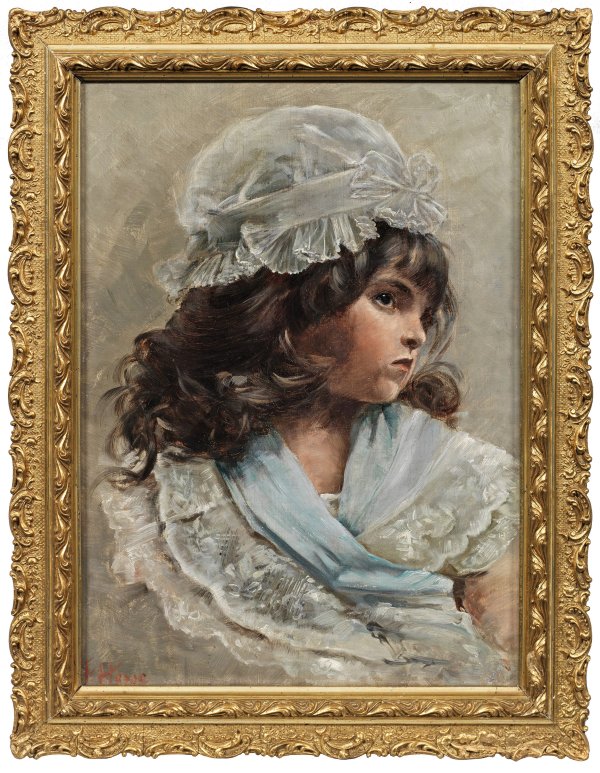 Feinfühlig charakterisierendes Portrait eines kleinen Mädchens mit schwarzen Locken. Felicitas Hesse, die Ehefrau und Schülerin des Malers Rudolf Hesse, studierte an der Kunstgewerbeschule in München. Öl/Lwd.; L. u. sign. sowie verso (von fremder Hand) in Bleistift bez. "Fel. Hesse". Rückseitiger Namensstempel (Besitzervermerk). 39 cm x 29,5 cm. Rahmen.
