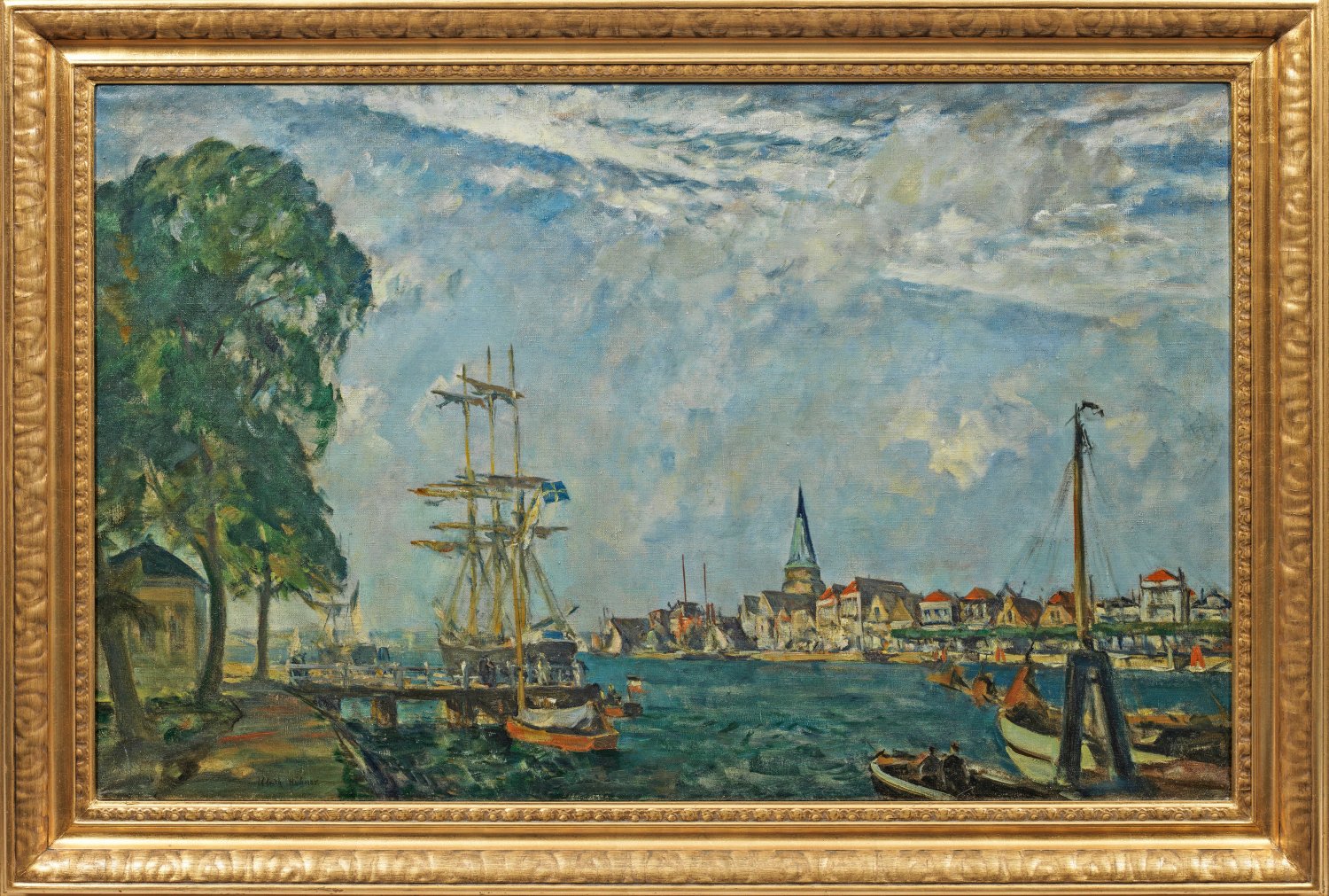 Großformatige Lübeck-Ansicht, der Blick geht auf die Trave und den Hafen mit schwedischem Dreimaster, gegenüber Häuser und der Turm der St. Lorenz-Kirche. Mit sehr breitem, schnellem Duktus gemalte, vom französischen Impressionismus beeinflusste Landschaft des an der Karlsruher Akademie ausgebildeten Künstlers. 1899 wurde Hübner Mitglied der Berliner Sezession und 1914 Professor für Landschaftsmalerei in Berlin. 1906-1912 schuf der Künstler im Lübecker Stadtteil Travemünde während sommerlicher Aufenthalte zahlreiche schwungvoll gemalte Hafenmotive, für deren Kompositionen hohe, flächig angelegte Himmel und ruhige, farbige Wasserflächen charakteristisch sind. Öl/Lwd.; L. u. sign.; 85 cm x 135,5 cm. Wohl Original-Rahmen.