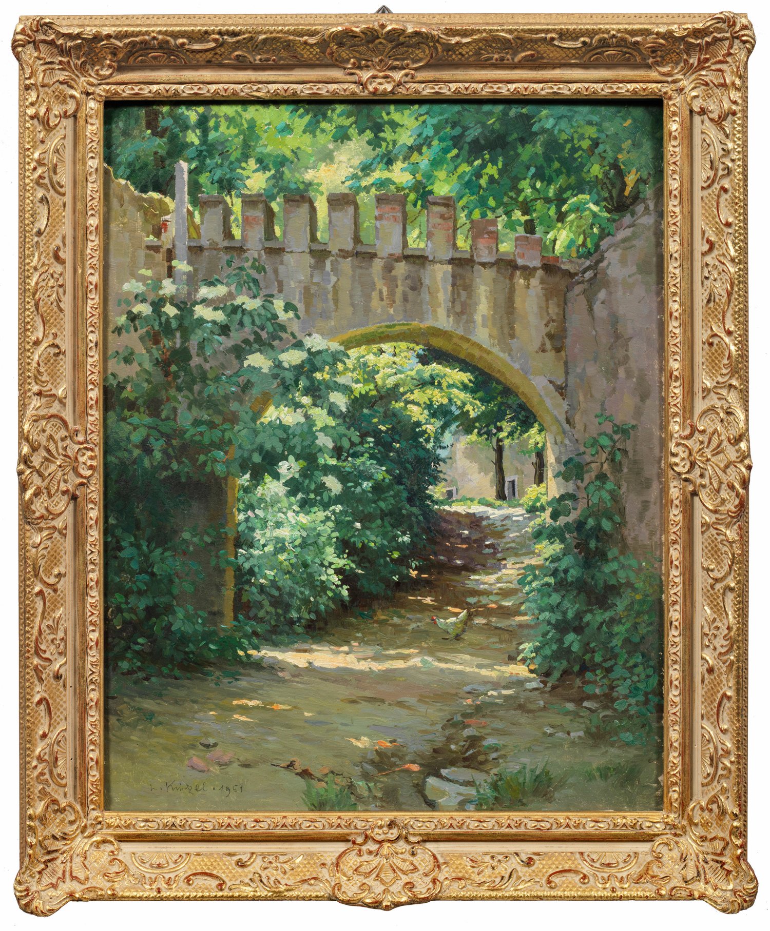 Liesl Kinzel, Tochter des Malers Josef Kinzel, erhielt ihre künstlerische Ausbildung bei Robert Russ und an der Wiener Kunstgewerbeschule bei Bertold Löffler und Koloman Moser. Als freischaffende Künstlerin, die ab 1913 im Wiener Künstlerhaus ausstellte, widmete sie sich vornehmlich Stillleben und Landschaften, wofür sie mit großer Vorliebe in der Wachau malte. Öl/Hartfaser. L. u. sign. u. dat. 1951. 50 cm x 39,5 cm. Rahmen.