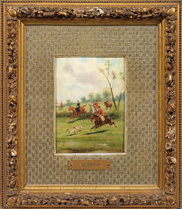 Feinflüssig gemalte Schilderung einer englischen Jagdgesellschaft, die den Hunden im rasanten Tempo auf ihren Pferden folgt. Öl/Holzplatte; Mittig u. sign.; Darstellung 21 cm x 15 cm. Rahmen.