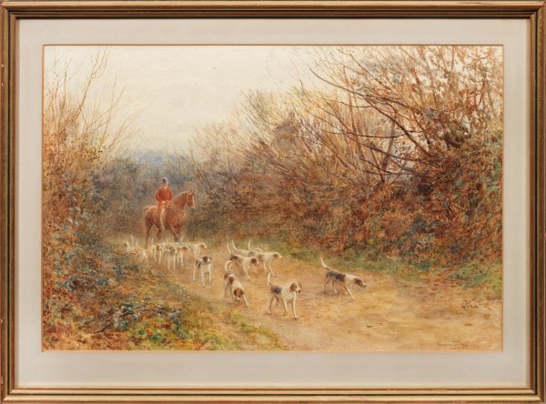 In stimmungsvoller Lichtgestaltung und herbstlichem, tonigem Kolorit schildert Taylor die klassische Jagdszene mit einem Reiter und seiner Jagdhundmeute. Aquarell/Bütten. R. u. sign. und dat. 1902. Darstellung 39 cm x 59 cm (Passepartoutausschnitt). Rahmen.