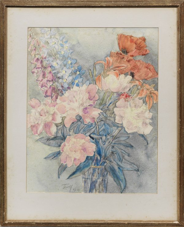 In einer Glasvase mit Goldrand der bunte Sommerblumenstrauß mit u. a. Rittersporn, Pfingstrosen und Tulpen. Tewes, der an der Münchner Akademie studierte, war Mitglied der Berliner Secession und der auf Initiative von Gustav Pauli gegründeten Bremer Künstlervereinigung Die Goldene Wolke. Aquarell und Bleistift/Papier; L. unten sign. und datiert 1941. Ger. stockfleckig. Darstellung 48 cm x 38 cm (Passepartoutausschnitt). Rahmen.
