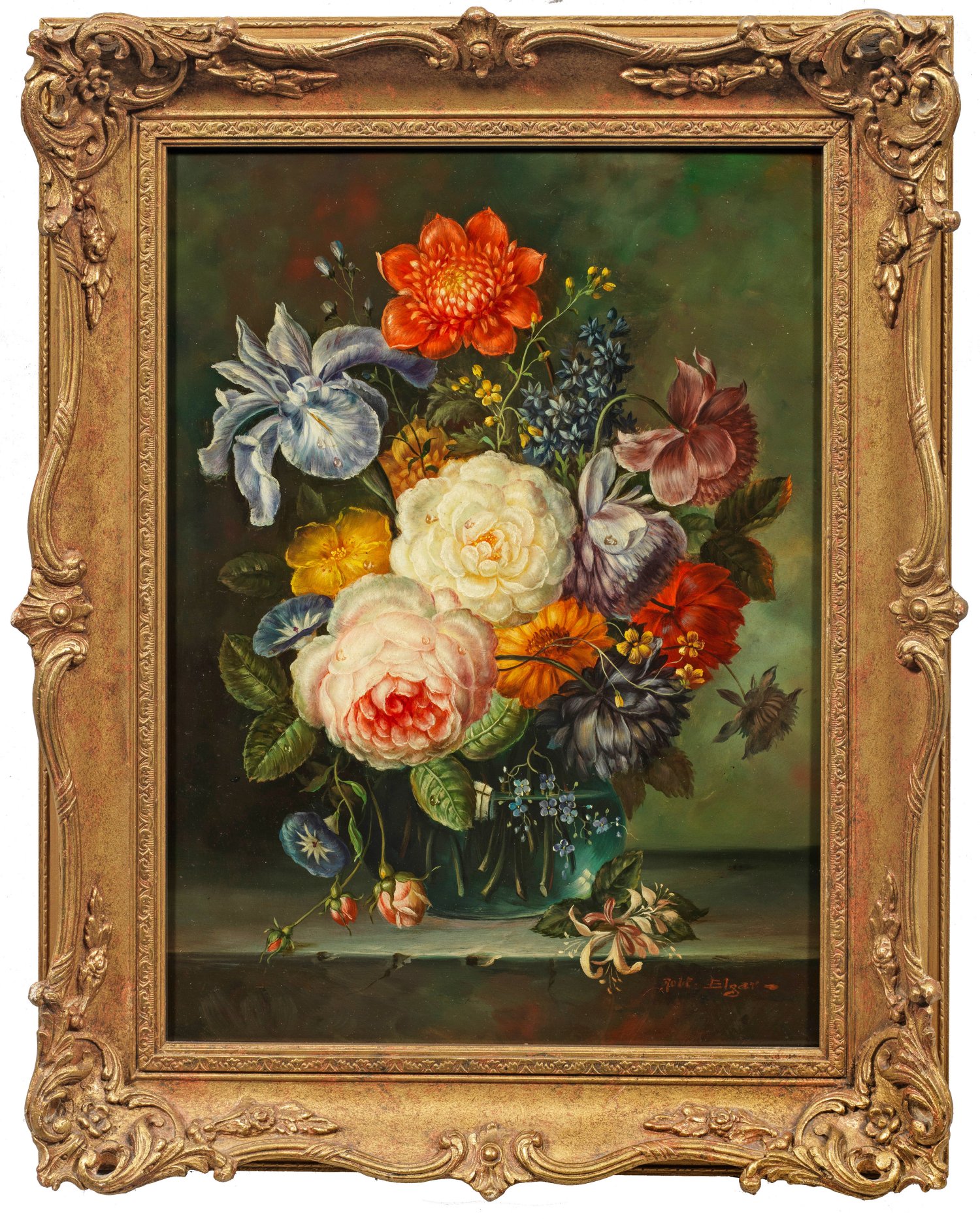Auf Steinkonsole der bunte Sommerblumenstrauß in kugeliger Glasvase. Ein in altmeisterlicher Manier gehaltenes Stillleben des aus Gloucestershire stammenden Malers, der regelmäßig im New England Art Club ausstellte. Öl/Holzplatte. R. u. sign. 40 x 59,5 cm. Rahmen.