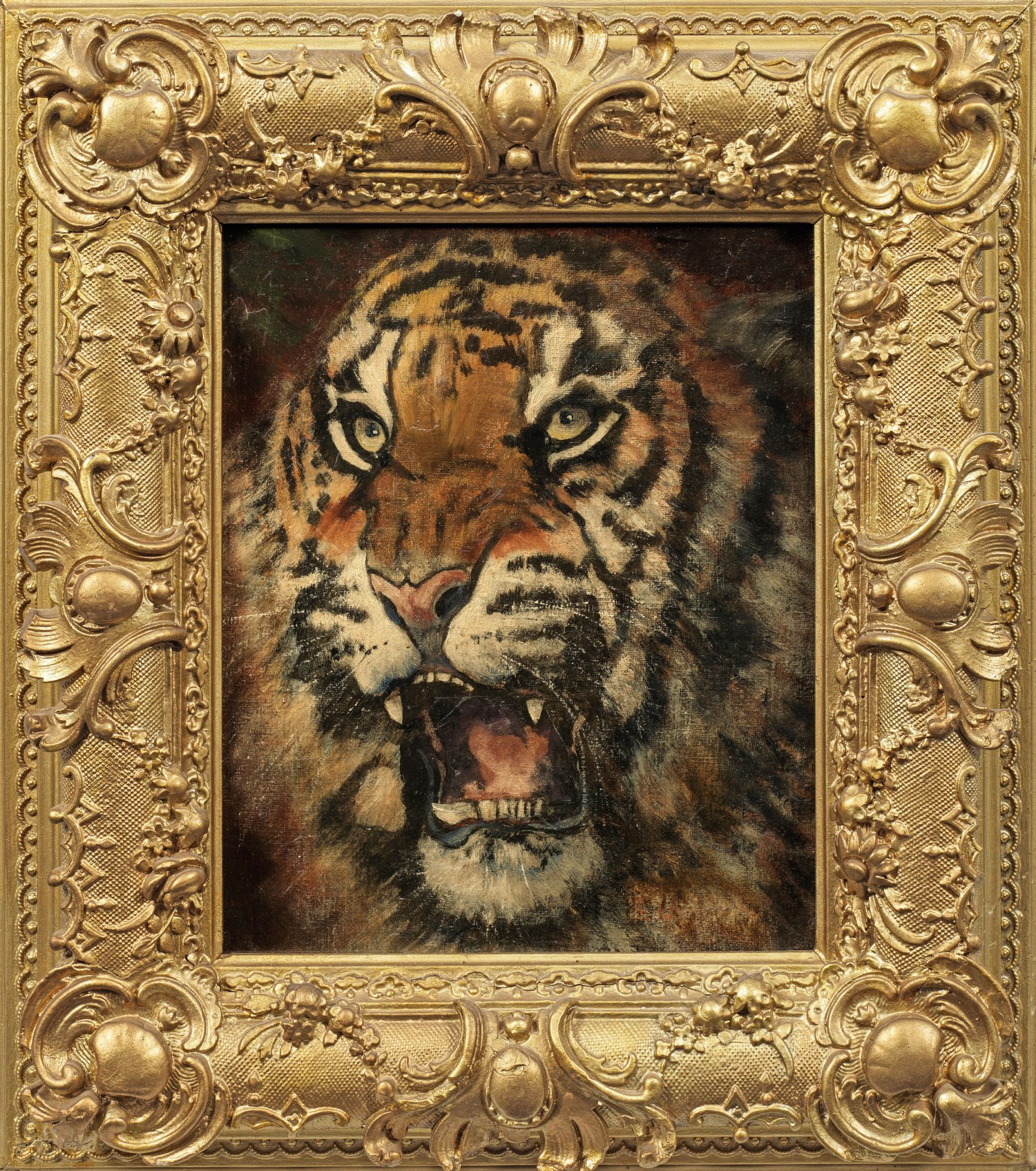 In virtuos lockerem Duktus gemalte, ausdrucksstarke und lebendig wirkende Darstellung der majestätischen Raubkatze, ihr Maul als Drohgebärde geöffnet. Öl/Lwd.; R. u. unleserlich sign. (oder monogr.). Rest.; 32 x 26,5 cm. Rahmen.