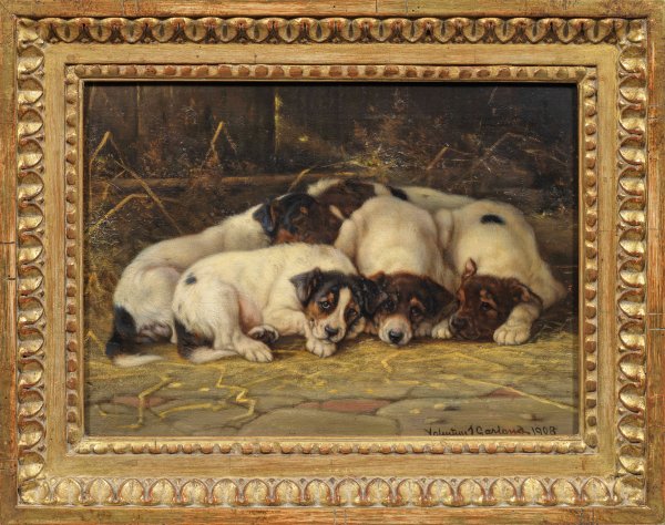 Einfühlsam und anrührend geschilderte Szene des auf Hundedarstellungen spezialisierten, bekannten Künstlers, der in Winchester ansässig war und seit 1867 häufig in der Royal Academy in London ausstellte. Öl/Holzplatte; R. u. sign. und dat. 1908. Ca. 23 cm x 31 cm. Rahmen.