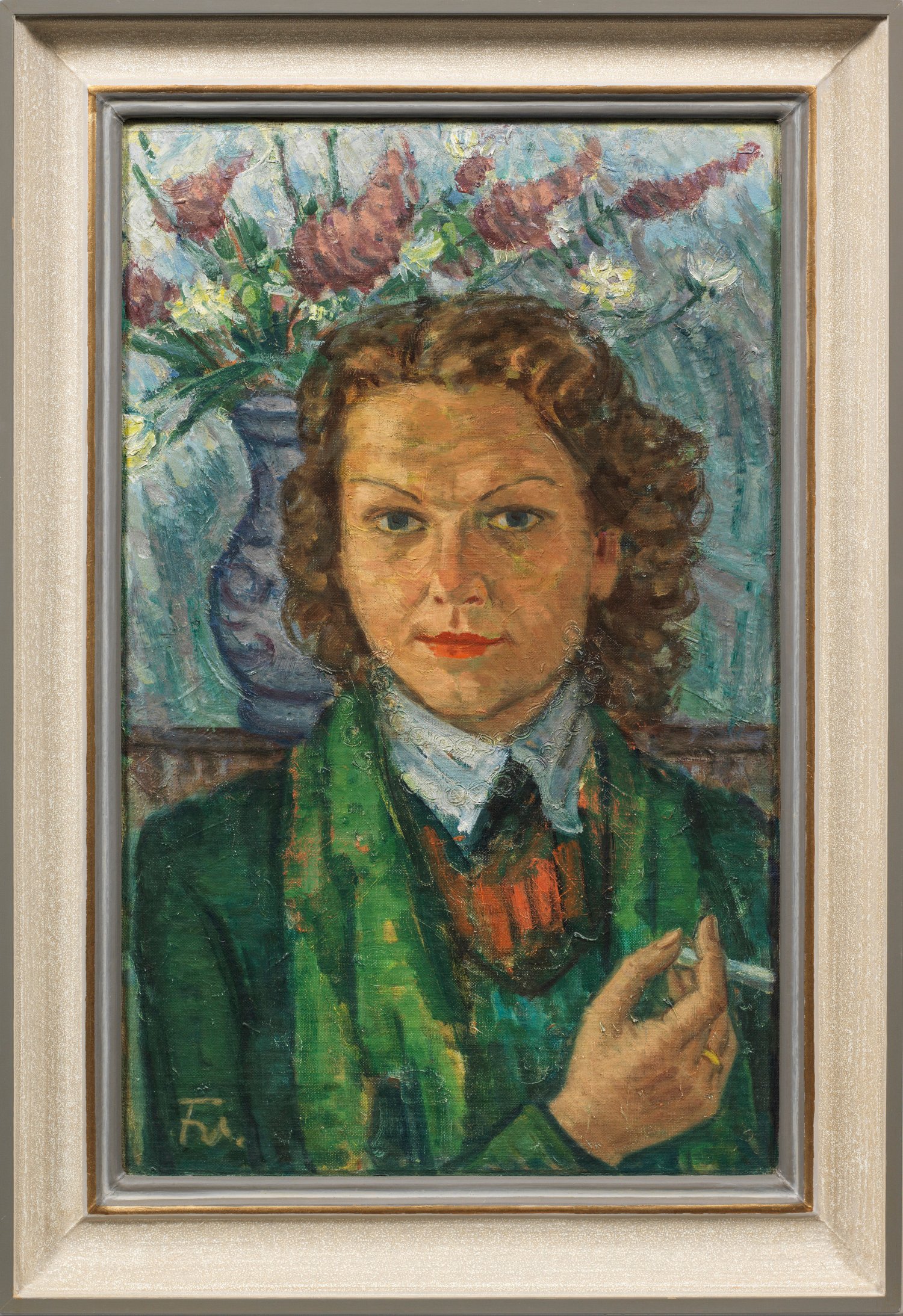 In kräftigem, expressionistischem Duktus das Bildnis der selbstbewusst charakterisierten jungen Frau mit Zigarette. Veersemann, der an der Kunstgewerbeschule in Bremen studierte, entwickelte Anfang der 1950er Jahre seinen für ihn typischen, abstrakten Stil, wobei die kräftige Linienführung bildbestimmend ist. Öl/Lwd., kaschiert a. Karton; L. u. monogrammiert; Verso sign. und mit Inv.-Nr. sowie auf einem Atelieretikett nummeriert, bez. und betitelt. 65 cm x 41,5 cm. Rahmen.